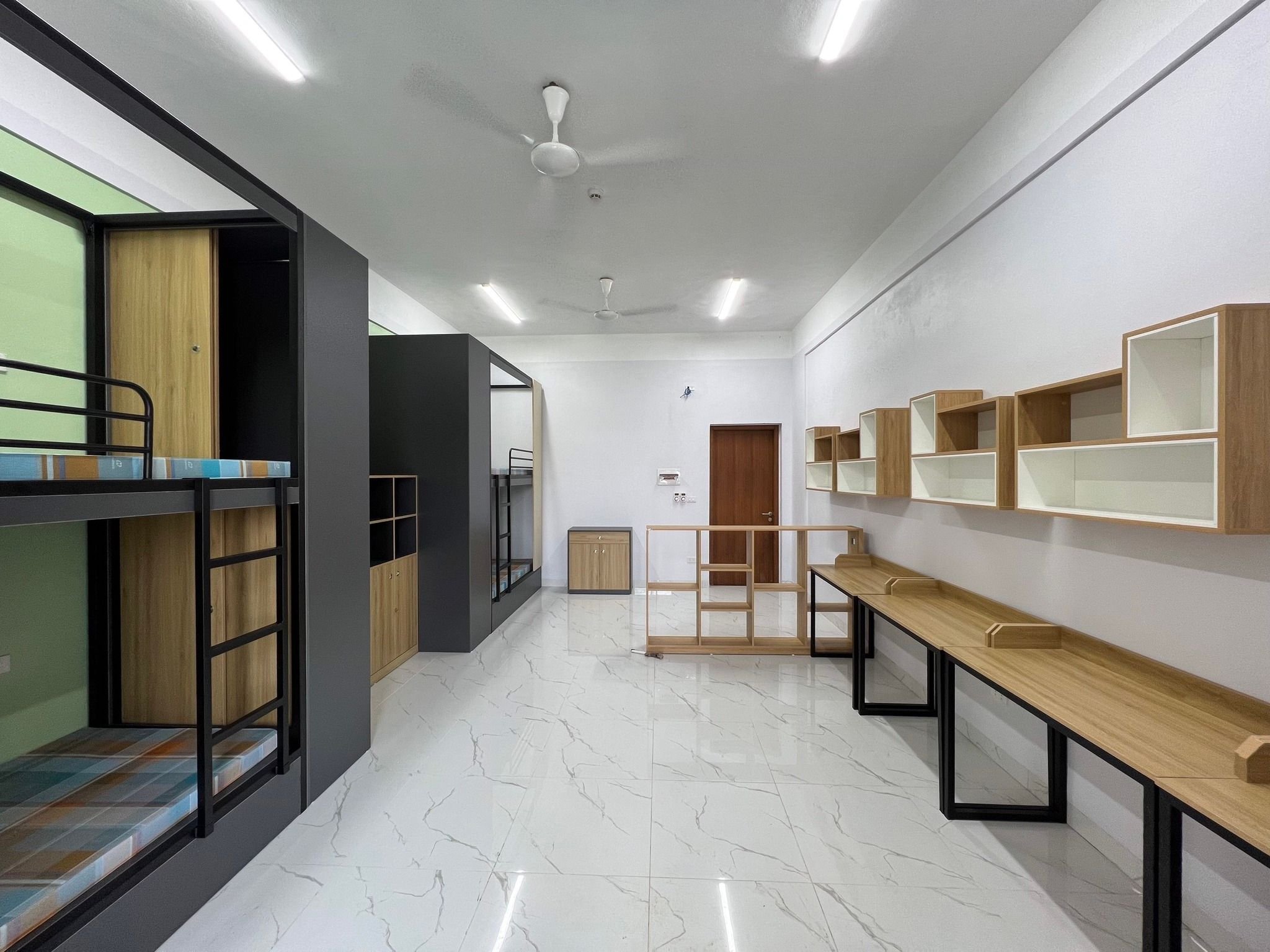 Đặc biệt tất cả các phòng đều có wifi miễn phí, điều hòa, bình nóng lạnh, quạt trần, bàn học, tủ đồ và đặc biệt là 2 phòng vệ sinh, 1 phòng tắm, 1 bồn rửa mặt… tiện nghi đảm bảo việc học tập, sinh hoạt mà không phải chen lấn như nhiều ký túc xá khác hay khi thuê trọ bên ngoài.