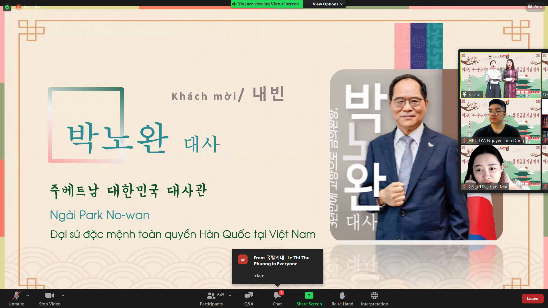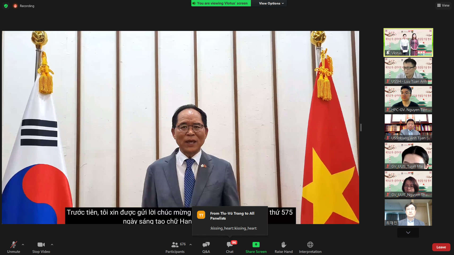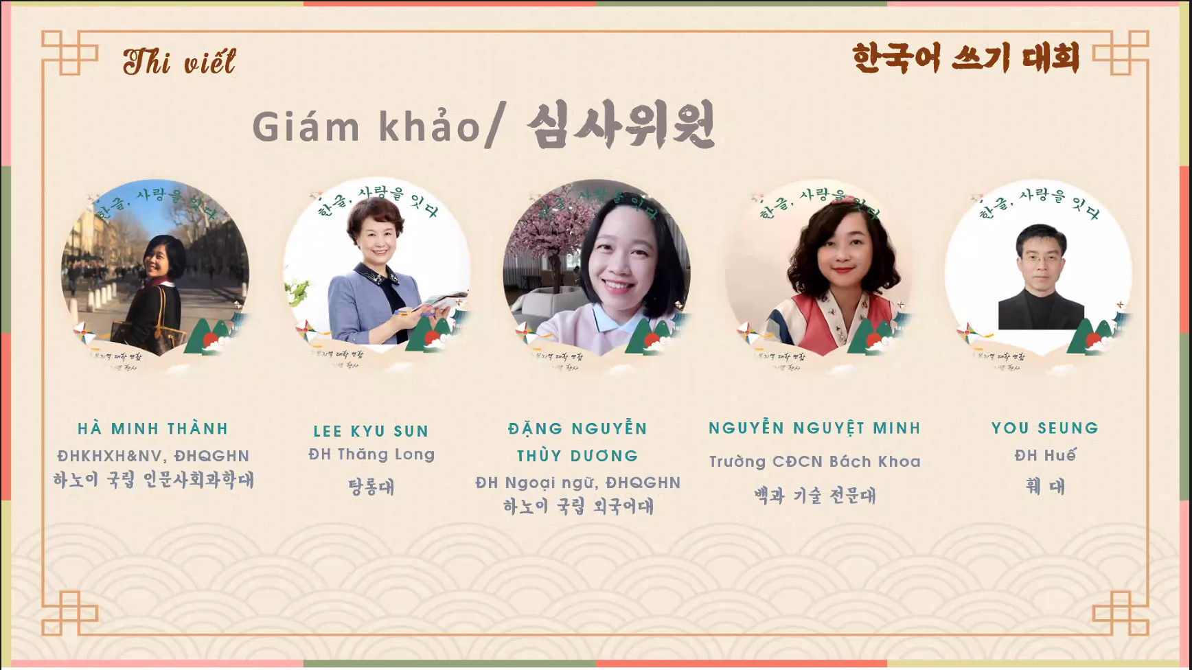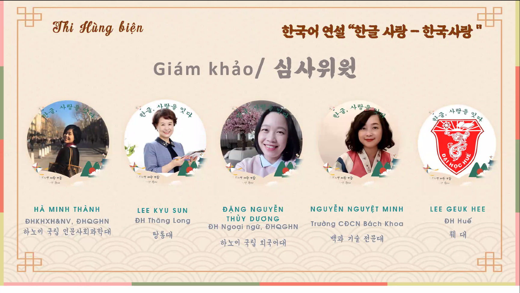 “Ban giám khảo đã làm việc rất hiệu quả và công tâm trong một thời gian ngắn nhưng đã đưa ra một kết quả theo như tôi đánh giá là tương đối khách quan. Với những tiêu chí cụ thể cho từng hạng mục, ở mỗi hạng mục ban tổ chức sẽ đưa ra từ 4 – 5 tiêu chí căn cứ từ đây để đánh giá các bài dự thi. Sau quá trình chấm điểm chúng tôi đã chọn ra các bài thi rất chất lượng, những bài thi này đã thể hiện được tài năng và tình yêu với Hàn Quốc và với chữ Hangeul ở các trường thành viên tham gia trong lễ hội. Tôi xin thay mặt ban giám khảo chúc mừng tất cả các em sinh viên đã tham gia vào các hạng mục thi trong lễ hội lần này”.