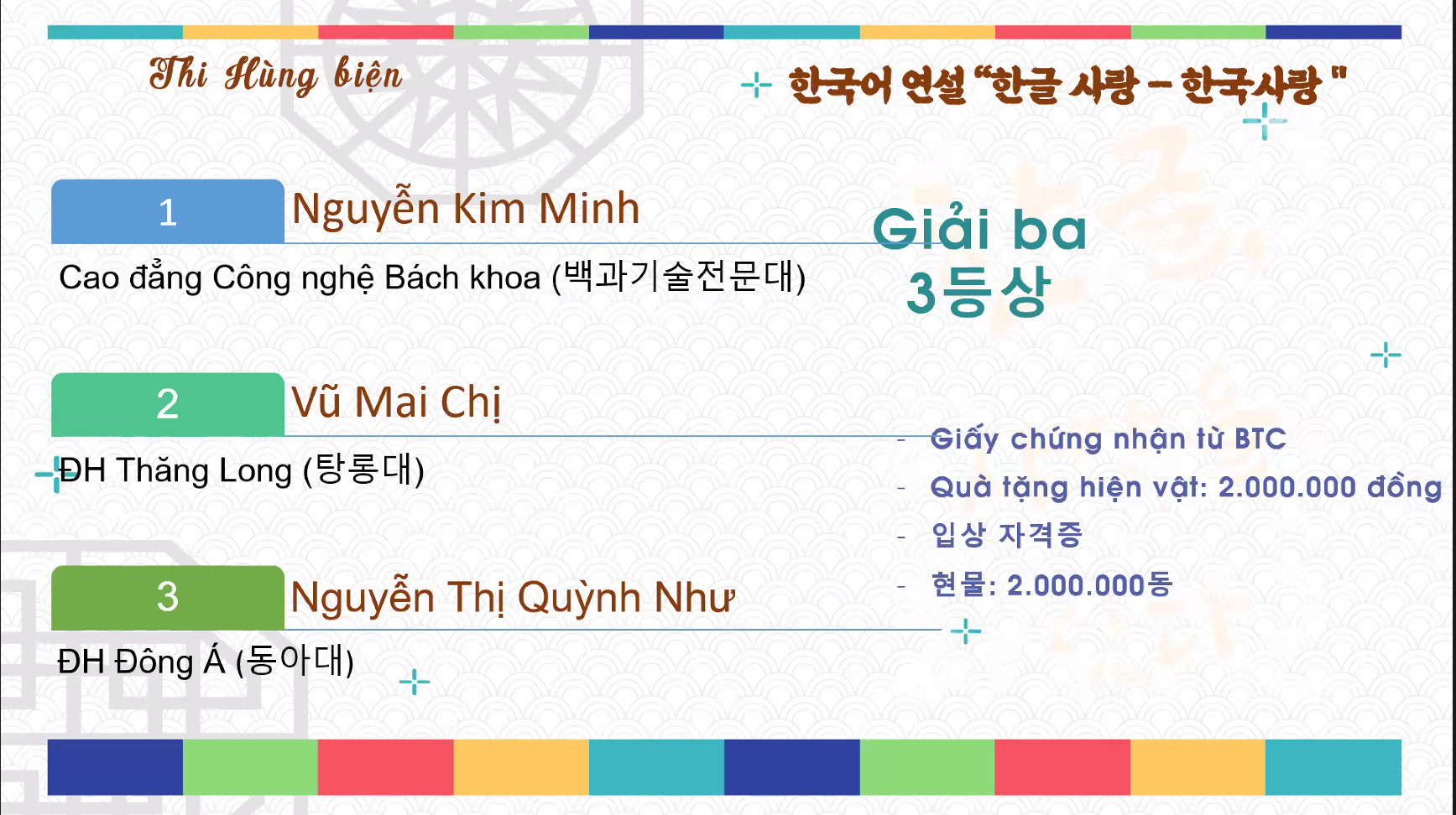 Vượt qua đông đảo các thí sinh đến từ 13 trường ĐH, CĐ trên toàn miền Bắc và miền Trung, đội tuyển HPC’ers khoa Ngôn ngữ và Văn hóa Hàn Quốc đã xuất sắc đem về 3 giải Ba cho Trường Cao đẳng Công nghệ Bách khoa Hà Nội trong 2 hạng mục quan trọng nhất gồm Thi Hùng biện và Thi Quiz. Niềm tự hào dâng cao khi đội tuyển HPC là trường Cao đẳng duy nhất có sinh viên đạt giải tại cuộc thi.