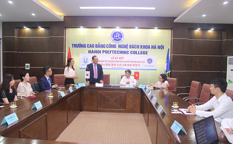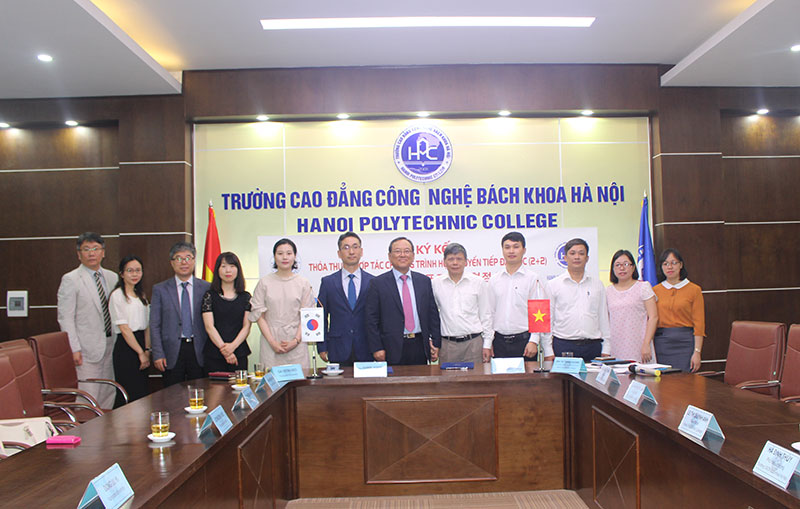 Ngài Shi Nil Yoon – Hiệu trưởng Đại học Kangnam và Thầy Ngô Văn Sự – Hiệu trưởng Trường Cao đẳng Công nghệ Bách khoa Hà Nội với biên bản ký kết.