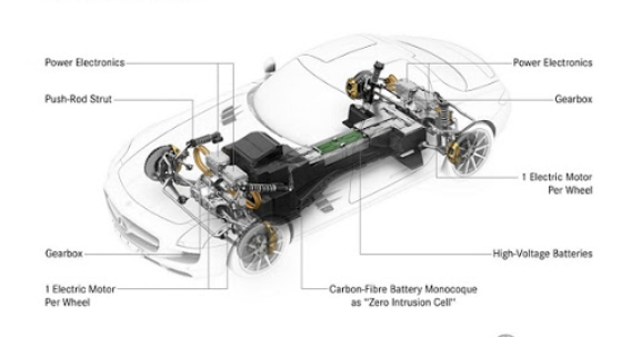 – Động cơ điện có hai hay bốn động cơ in-wheel lắp trong mỗi bánh xe