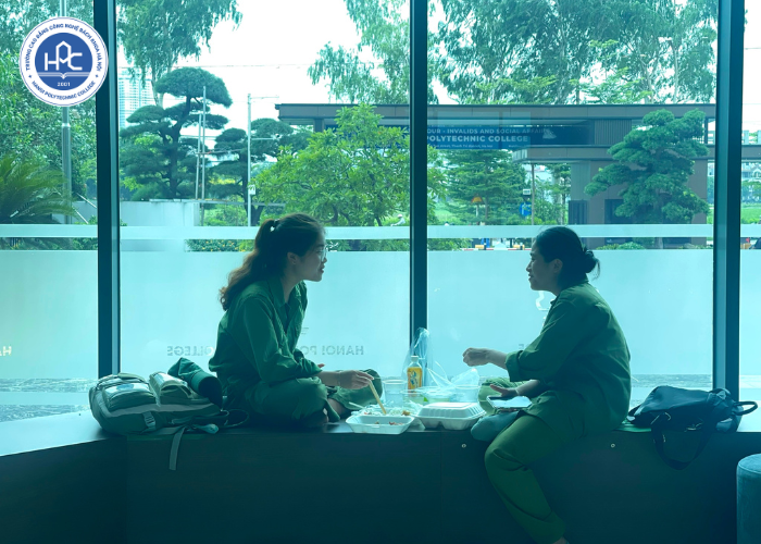Ở sảnh tòa hiệu bộ, tôi thấy đôi bạn thân đang ngồi ăn trưa với nhau. Dù buổi sáng hai bạn còn mệt mỏi vì tập luyện và chuẩn bị cho sự kiện quan trọng, nhưng đôi bạn này vẫn rất tươi tắn, giúp không khí bữa ăn trưa tại HPC thân thiện hơn bao giờ hết.Ở ngoài cửa phụ tòa hiệu bộ, tôi bắt gặp một nhóm bạn phụ trách đặt đồ ăn cho cả lớp. Trong lúc chờ đợi người giao đồ ăn, các bạn sinh viên cười đùa với nhau vui vẻ, nhưng không quên nói với nhau: “Đói thế nhỉ!”. Thấy đồ ăn mang đến, mặt ai nấy không khỏi toát ra vẻ hạnh phúc. Các bạn hồ hởi nhận lấy đồ ăn cho cả “tiểu đội”, hỗ trợ nhau mỗi bạn xách vài túi đồ ăn mang về phòng. Món bún bò Huế nóng hổi tỏa hương thơm lừng thách thức sự kiên nhẫn của những chiếc bụng đói. Tôi đứng cạnh cũng không kìm được mà hít hà cho … “đỡ đói”.Tôi thấy có nhóm mang đồ ăn về phòng học, ngồi ăn mát rượi dưới hơi lạnh của điều hòa. Có nhóm chọn địa điểm ăn ngay sảnh chờ HPC vì ở đây mát lắm. Tôi đi dọc một lượt và bị thu hút bởi đồ ăn của các bạn. Màu sắc bắt mắt, hương thơm đặc trưng đến từ cơm, bún, phở, canh, rau, thịt,… khiến tôi phải thực sự kìm nén. Đã vậy, nhiều sinh viên thấy tôi còn quảng cáo đồ ăn, mời tôi ăn cùng. Tôi cũng ước gì mình được ngồi ăn cùng các bạn, nhưng chân tôi vẫn muốn đi khám phá góc khác, xem còn điều gì thú vị. Tôi tiếp tục đi dọc hành lang, bắt gặp nhiều nhóm nhỏ đứng ở góc riêng tư, tận hưởng vài cốc trà chanh mát mẻ. Cốc trà chanh lúc này đúng là “chân ái”, đánh tan cái nóng gần 39*C ngoài trời. Tôi nghĩ thầm, chắc hôm nay mấy quán nước trong căng-tin đông đúc hơn bao giờ hết.No cái bụng, các bạn cùng nhau chia sẻ những câu chuyện cá nhân, về môn học GDQP&AN. Hầu hết các bạn đều nói “mệt, nóng”, nhưng “rất vui”.Thời gian nghỉ trưa này, các “đồng chí áo xanh” tranh thủ vừa ăn, vừa thư giãn, giao lưu và tạo nên những kỷ niệm đẹp trong quãng đời sinh viên.Tôi chợt nghe thấy tiếng cười giòn tan của nhóm bạn đang ăn trong lớp. Các bạn kể cho nhau nghe những câu chuyện hài hước, làm cho không khí bữa trưa thêm phần vui vẻ và sôi động. Tôi thấy mà cũng vui lây.Ở một góc khác, các bạn ngồi ăn chăm chú nhưng không quên chia sẻ đồ ăn với nhau. “Ăn nhiều rau vào cho … healthy”, một bạn nói. Bạn khác nhanh nhảu đứng lên gắp rau cho vào bát bún đang nóng hổi của đồng đội.Đồ ăn nóng hổi, các bạn tranh thủ “tận hưởng”. Tôi cũng xin phép chụp nhanh vài tấm ảnh rồi đi chỗ khác, để các bạn ăn uống tự nhiên, tránh nói chuyện với tôi mà mất … “năng suất”.Kỷ niệm ăn trưa với nhau vui như vậy nên các bạn không thể quên chụp ảnh selfie để lưu lại. Bởi ngày Hội thao GDQP&AN chỉ có một lần trong đời sinh viên nên không ai muốn để nó trôi đi một cách đáng tiếc.Ăn xong, tôi thấy ai nấy đều có một năng lượng và tinh thần phấn chấn. Vậy mới thấy, một bữa ăn ngon không chỉ cung cấp năng lượng, tạo ra động lực để tiếp tục hoạt động mà còn “xoa dịu tâm hồn”. Sau khi “càn quét” đồ ăn, tôi thấy các “đồng chí áo xanh” không giấu nổi nụ cười thỏa mãn trên gương mặt. Bữa trưa này không chỉ giúp các bạn no bụng, mà còn là lúc để gắn kết tình bạn, tình đồng chí. Sau khi nghỉ trưa, các bạn chào tạm biệt nhau để quay trở lại Hội thao với những câu chuyện còn dang dở. Còn tôi tiếp tục công việc của mình, với một chiếc bụng đói và một chùm ảnh, với những câu chuyện thú vị đằng sau.