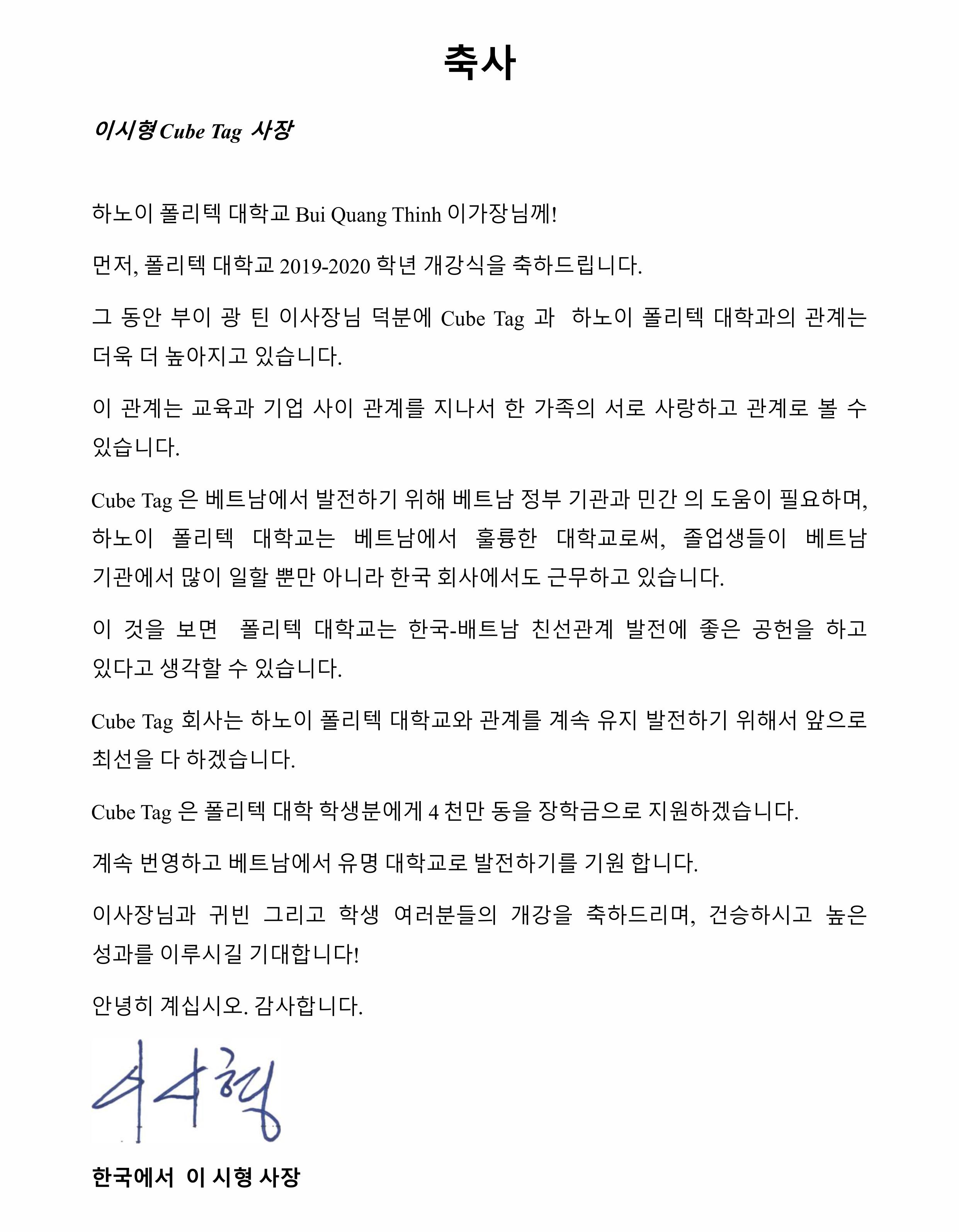 Tổng Giám đốc Công ty Cube Tag Vina gửi Thư chúc mừng Lễ Khai giảng của Trường