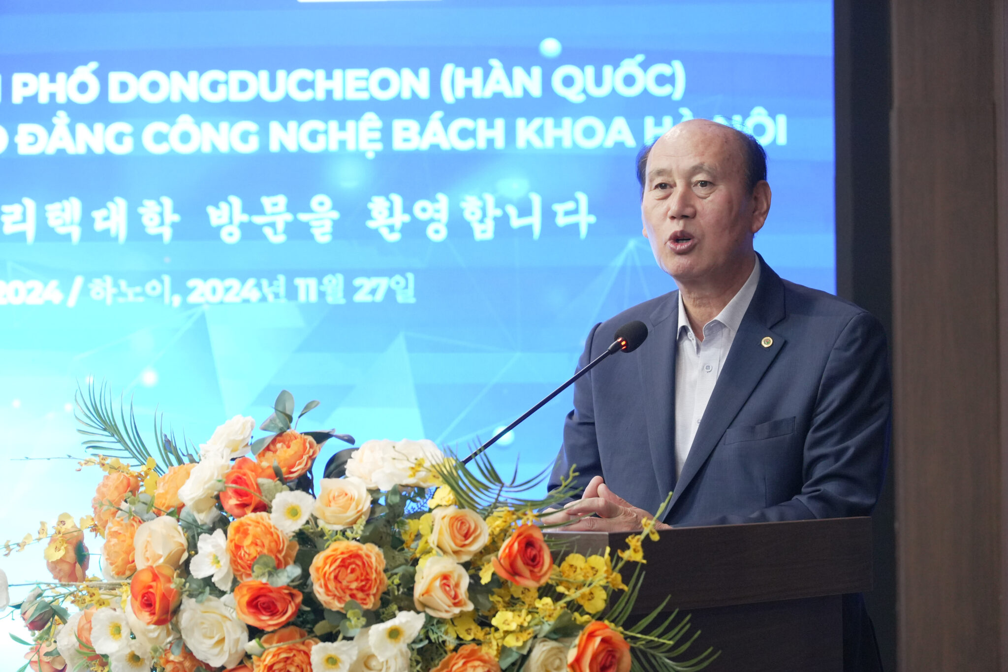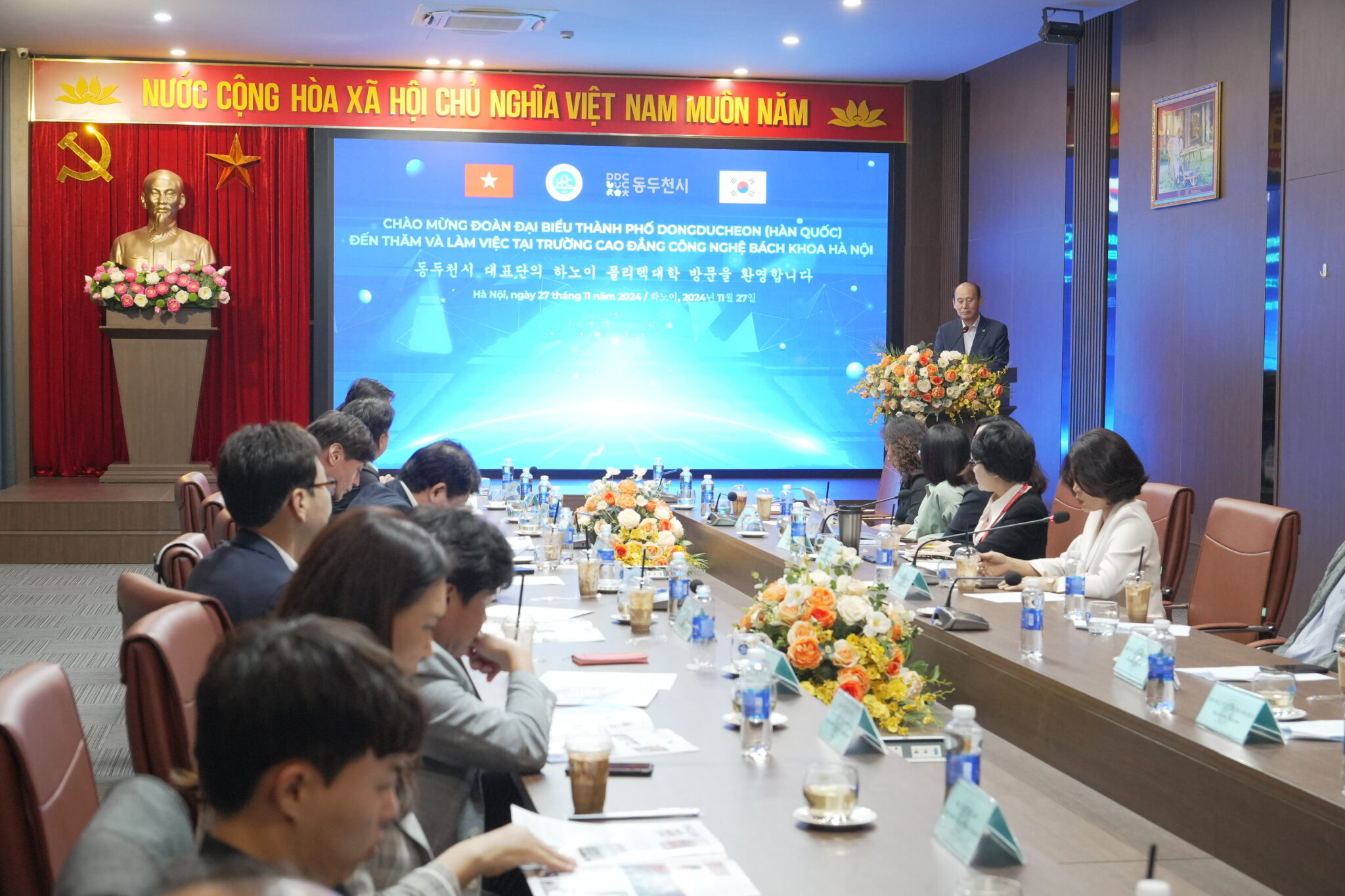 Bày tỏ vui mừng trong chuyến đến thăm và trao học bổng tại Trường Cao đẳng Công nghệ Bách khoa Hà Nội (HPC), ông Park HyungDuk – Thị trưởng thành phố Dongducheon đánh giá cao về chất lượng, quy mô đào tạo của HPC và cảm ơn sự tiếp đón nồng hậu của Nhà trường dành cho đoàn. Đồng thời, mong muốn sẽ được đồng hành, hỗ trợ nhiều hơn nữa cho sinh viên HPC khi du học tại Hàn Quốc.