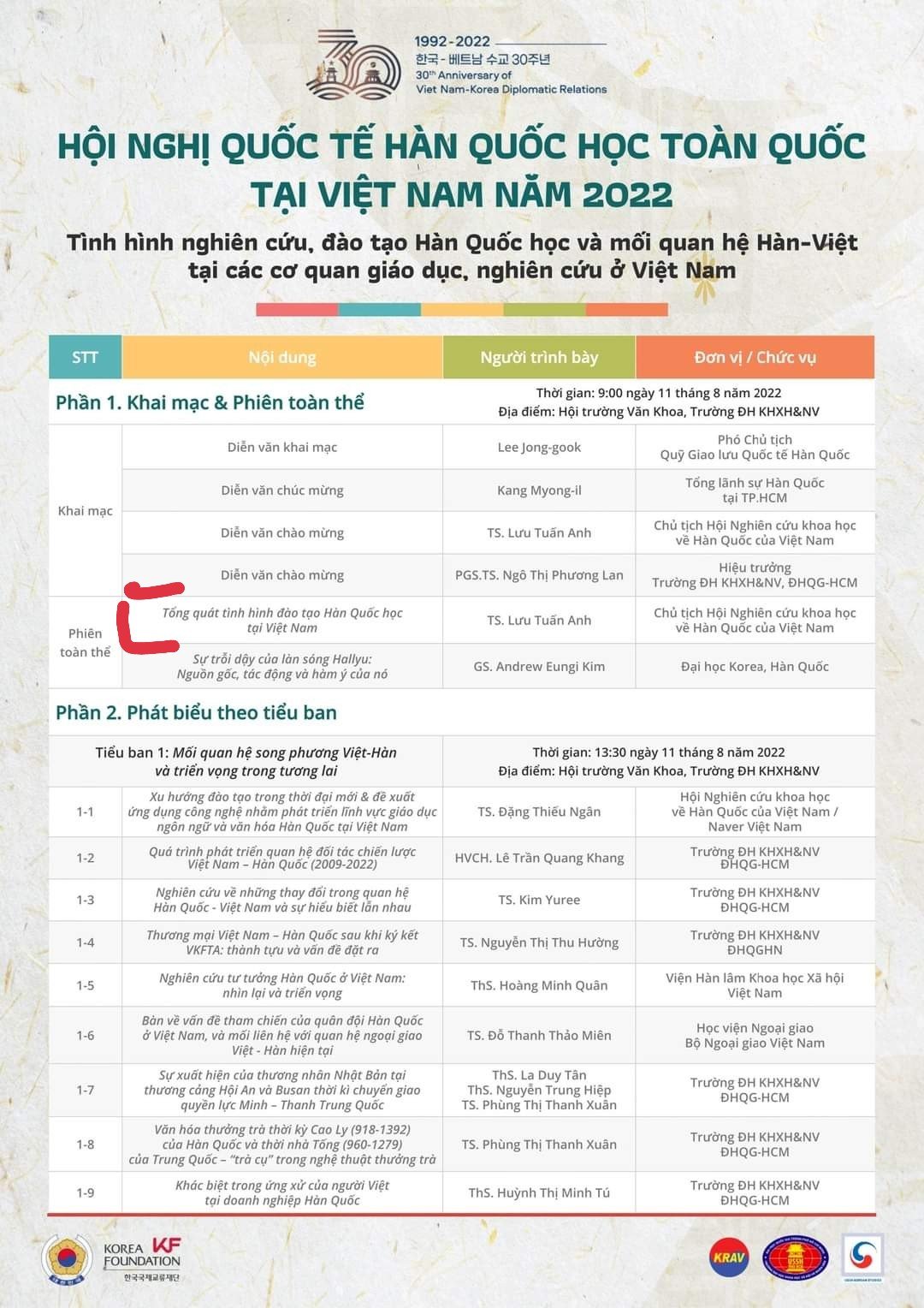 📣Tham dự Hội nghị có ông Kang Myong Gil, Tổng lãnh sự Lãnh sự quán Hàn Quốc tại TP.HCM; ông Lee Jong Kook, Phó chủ tịch quỹ giao lưu quốc tế Hàn Quốc; ông Lưu Tuấn Anh, chủ tịch Hội nghiên cứu khoa học về Hàn Quốc của Việt Nam; PGS.TS Ngô Thị Phương Lan, Hiệu trưởng trường Đại học Khoa học Xã hội và Nhân văn, Đại học Quốc gia TPHCM …