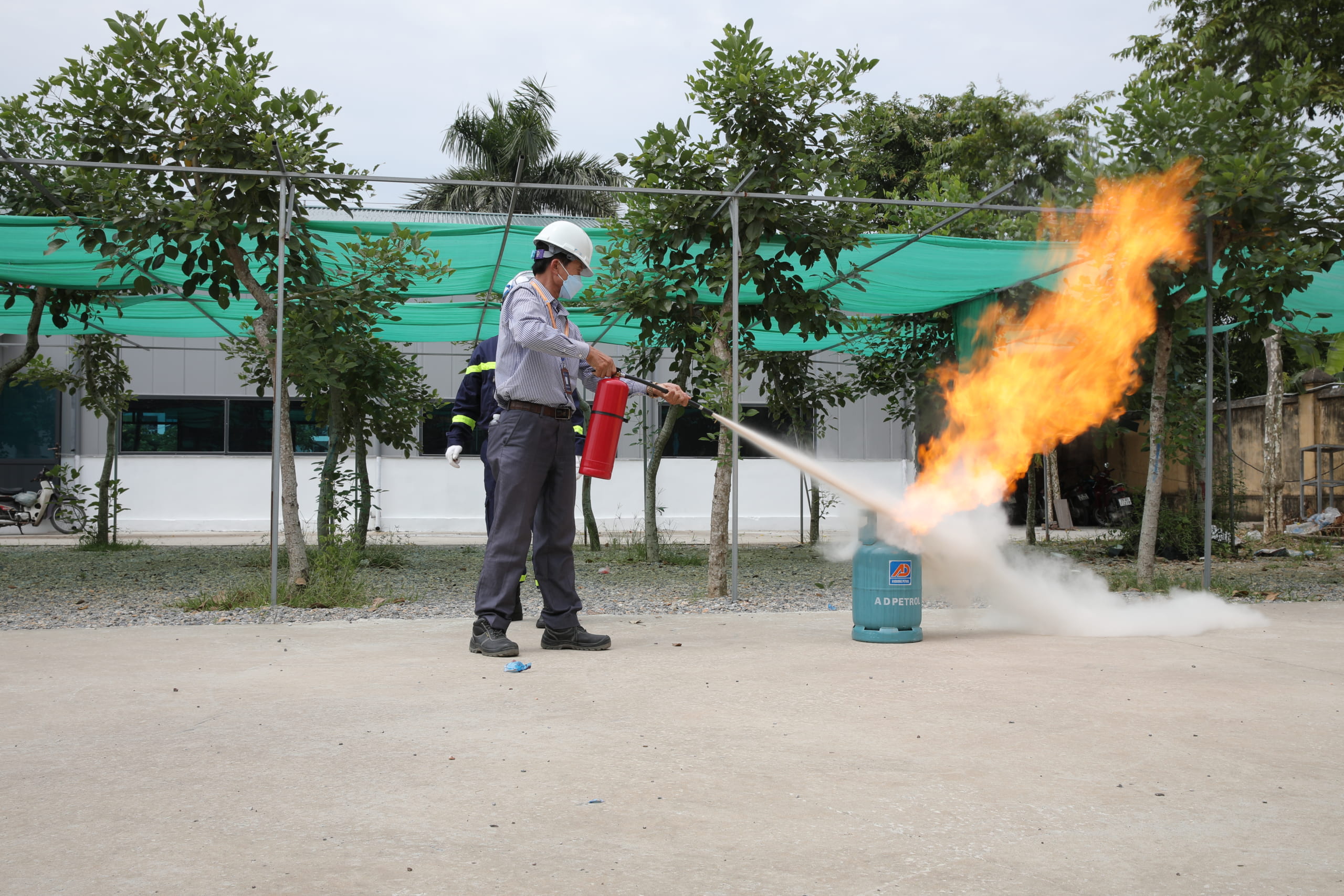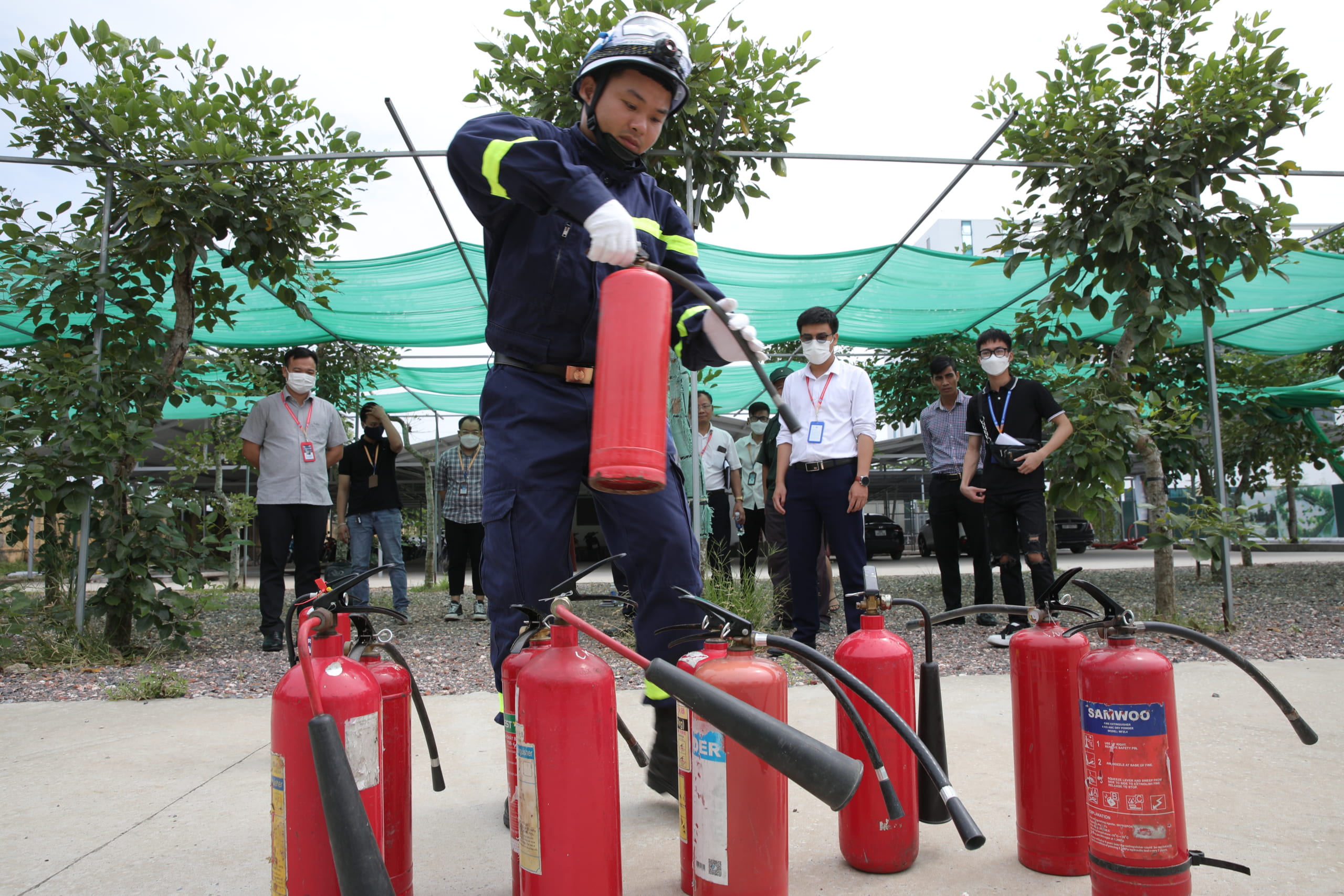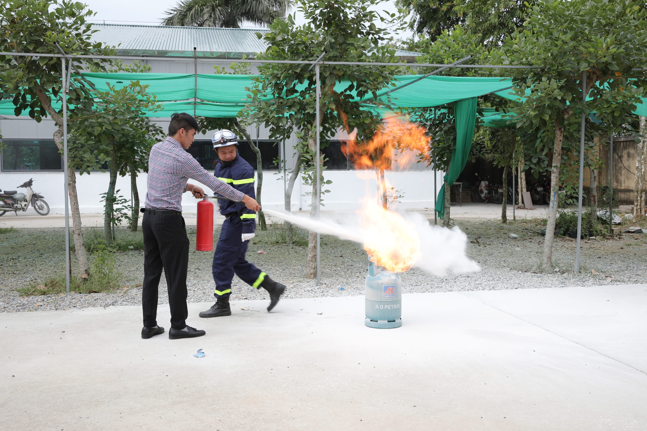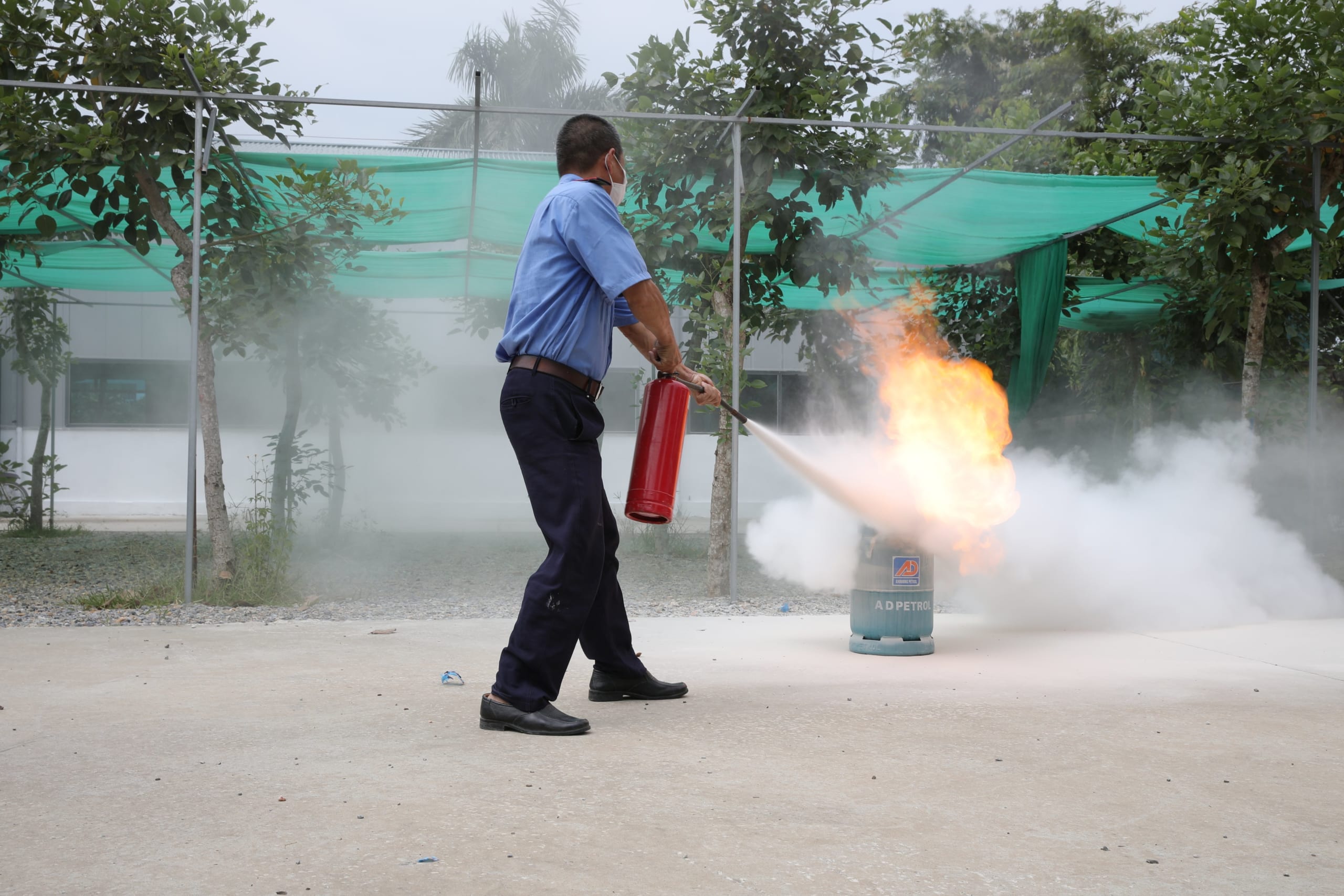 Sau buổi học lý thuyết, mỗi cán bộ, giảng viên, sinh viên HPC đã được Đội PCCC cơ sở hướng dẫn thực hành cách sử dụng các phương tiện bình bột, bình CO2 để dập tắt đám cháy giả định và cách thức xử lý nhanh các tình huống có thể xảy ra.