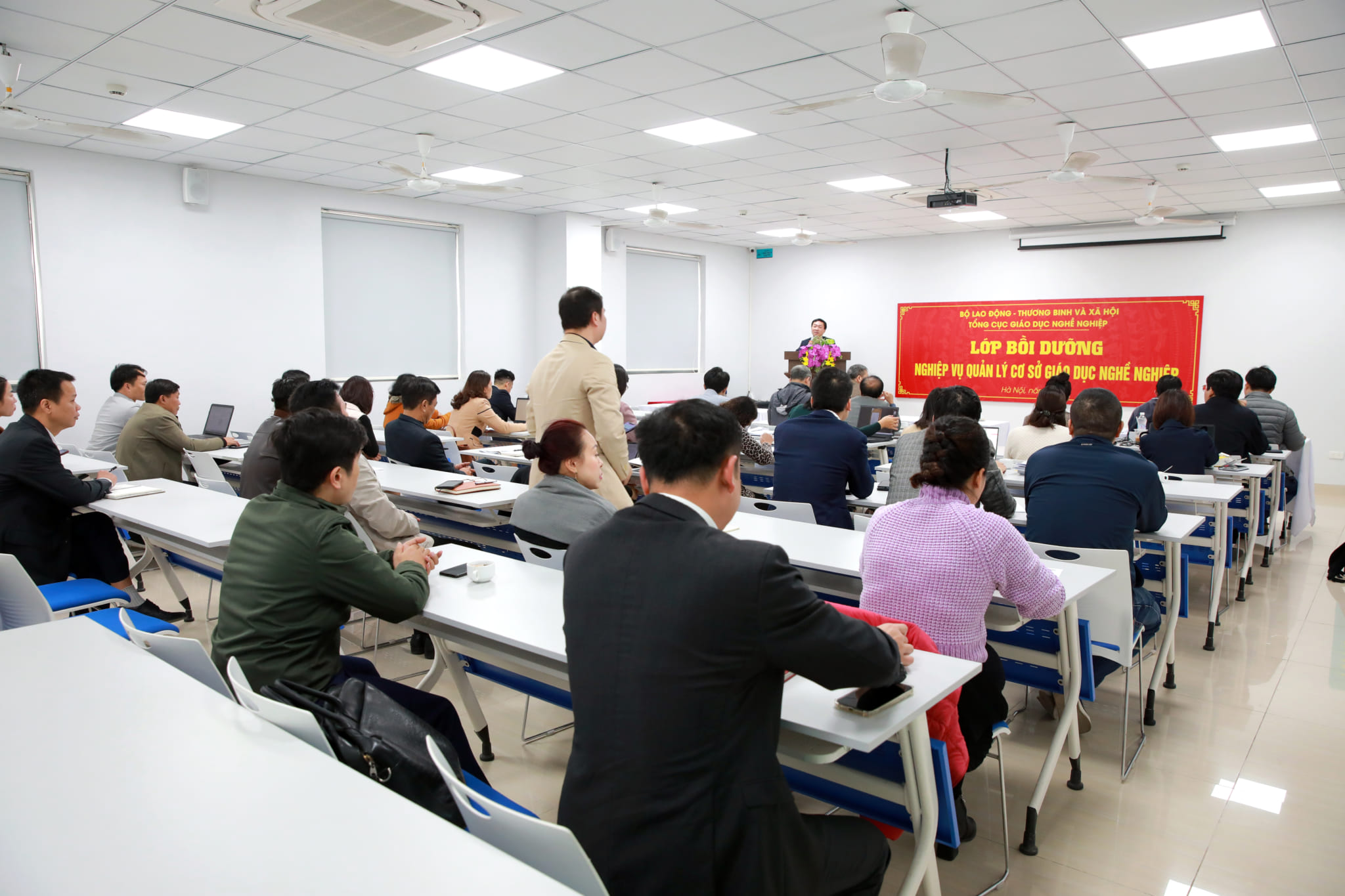Tại buổi Khai mạc, Đồng chí Bùi Kim Giang – Phó vụ trưởng Vụ Tổ chức Cán bộ đã phát biểu Khai giảng lớp bồi dưỡng Quản lý cơ sở giáo dục nghề nghiệp.