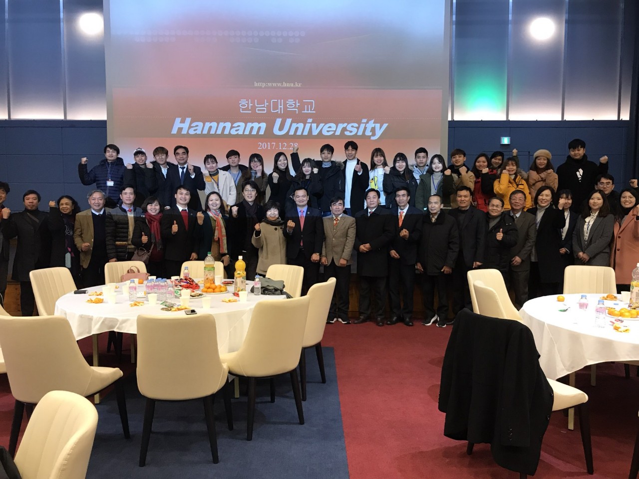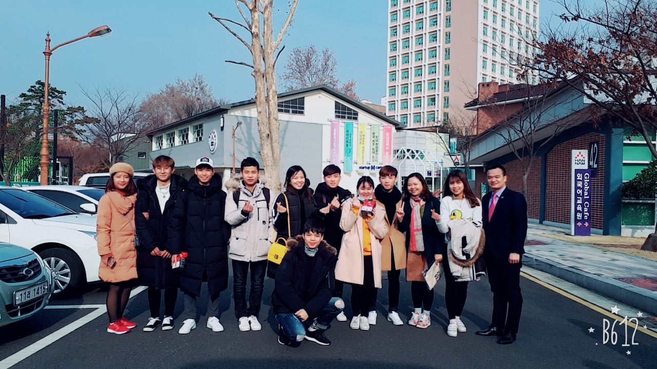 Du học sinh HPC đang học tập tại Đại học Hannam Hàn Quốc chụp ảnh lưu niệm với Ban giám hiệu trường