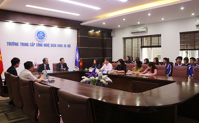 Đại diện Ban lãnh đạo Trường Trung cấp Công nghệ Bách khoa Hà Nội tiếp đón đoàn lãnh đạo trường Đại học Konyang có Thầy Ngô Văn Sự – Hiệu trưởng nhà trường, Thầy Bùi Quang Thịnh – Chủ tịch Hội đồng Giáo dục nhà trường, cô Lê Thị Quỳnh Anh – Phó Hiệu trưởng nhà trường.