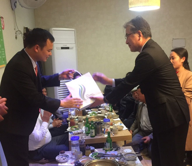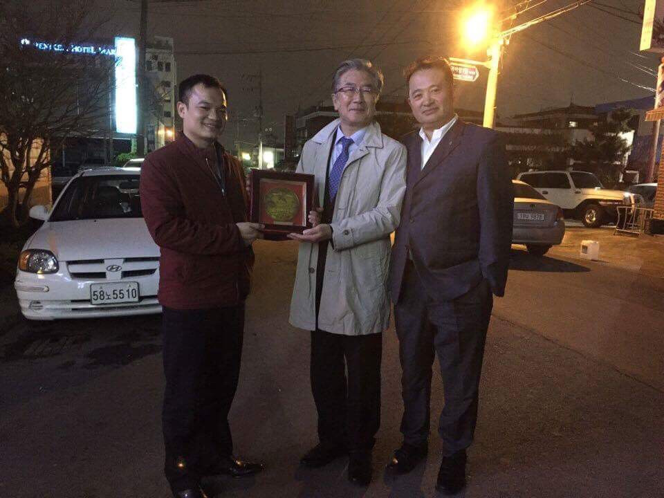 Thầy Bùi Quang Thịnh, Chủ tịch Hội đồng giáo dục Trường Trung cấp Công nghệ Bách khoa Hà Nội tặng quà GS. Doo Cheol Kim, Phó Hiệu trưởng Trường Đại học Quốc gia Jeju