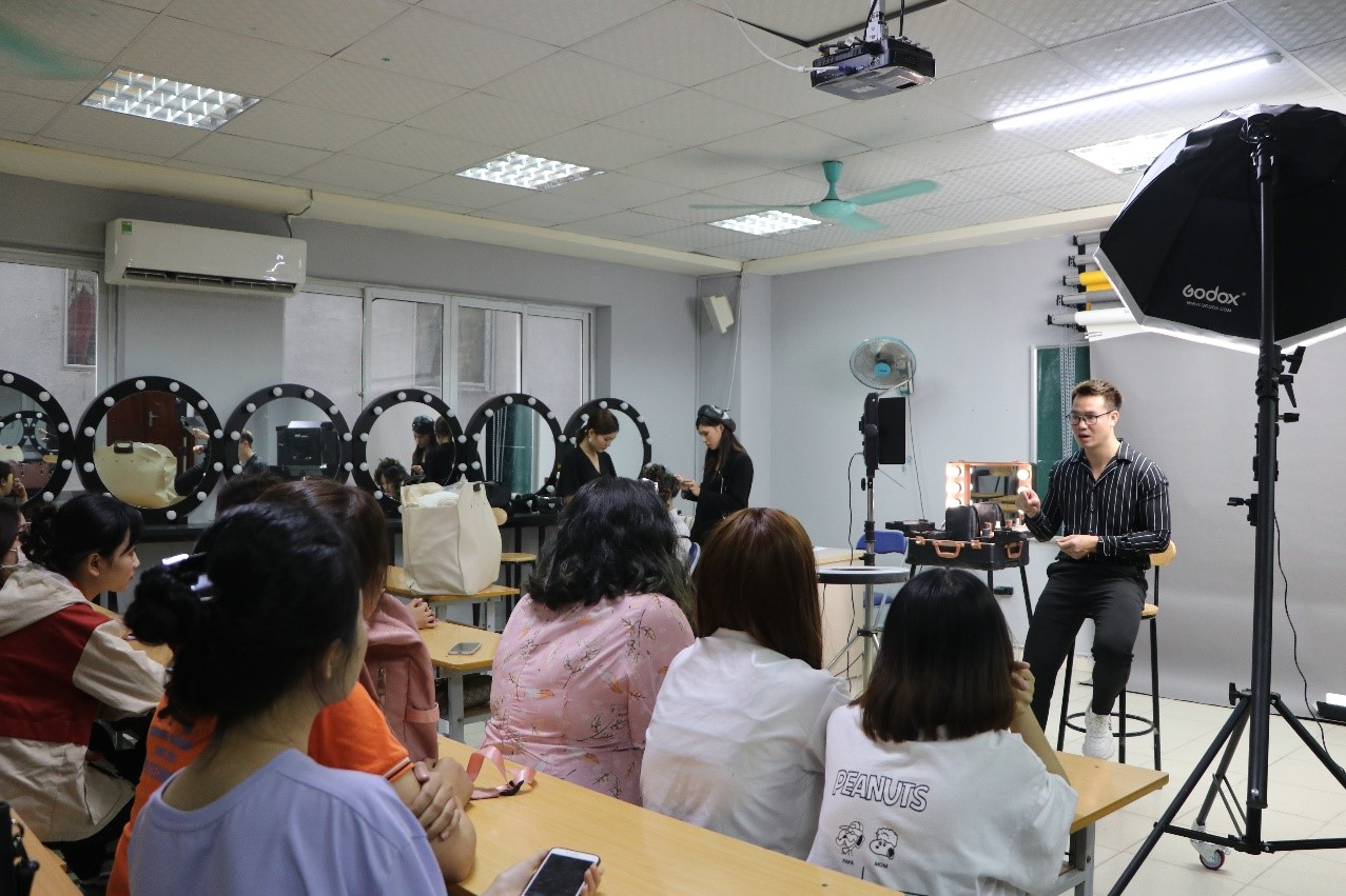 • Phòng học trang điểm lớn được đầu tư hệ thống bàn gương trang điểm đèn LED thế hệ mới nhất, đảm bảo các yêu cầu khắt khe nhất của nghề như: ánh sáng trung thực, gương soi sáng đẹp, không ố, mốc, đen, soi bị 2 bóng trong gương, không gây hại mắt, đảm bảo người học quan sát được chính xác các kỹ thuật, đường nét và hiệu ứng trang điểm. Ngoài ra, Phòng học trang điểm lớn còn có hệ thống máy chiếu để giảng dạy lý thuyết, studio trang điểm với hệ thống ánh sáng chuyên nghiệp trong trường quay để giúp học viên có thể ghi nhận, theo dõi và thực hành theo một cách chuẩn xác nhất toàn bộ cấu trúc gương mặt người mẫu, toàn bộ quá trình “họa mặt” cho người mẫu cho tới khi lên các sản phẩm như ghi hình TVC quảng cáo, chụp ảnh tạp chí, thời trang…
