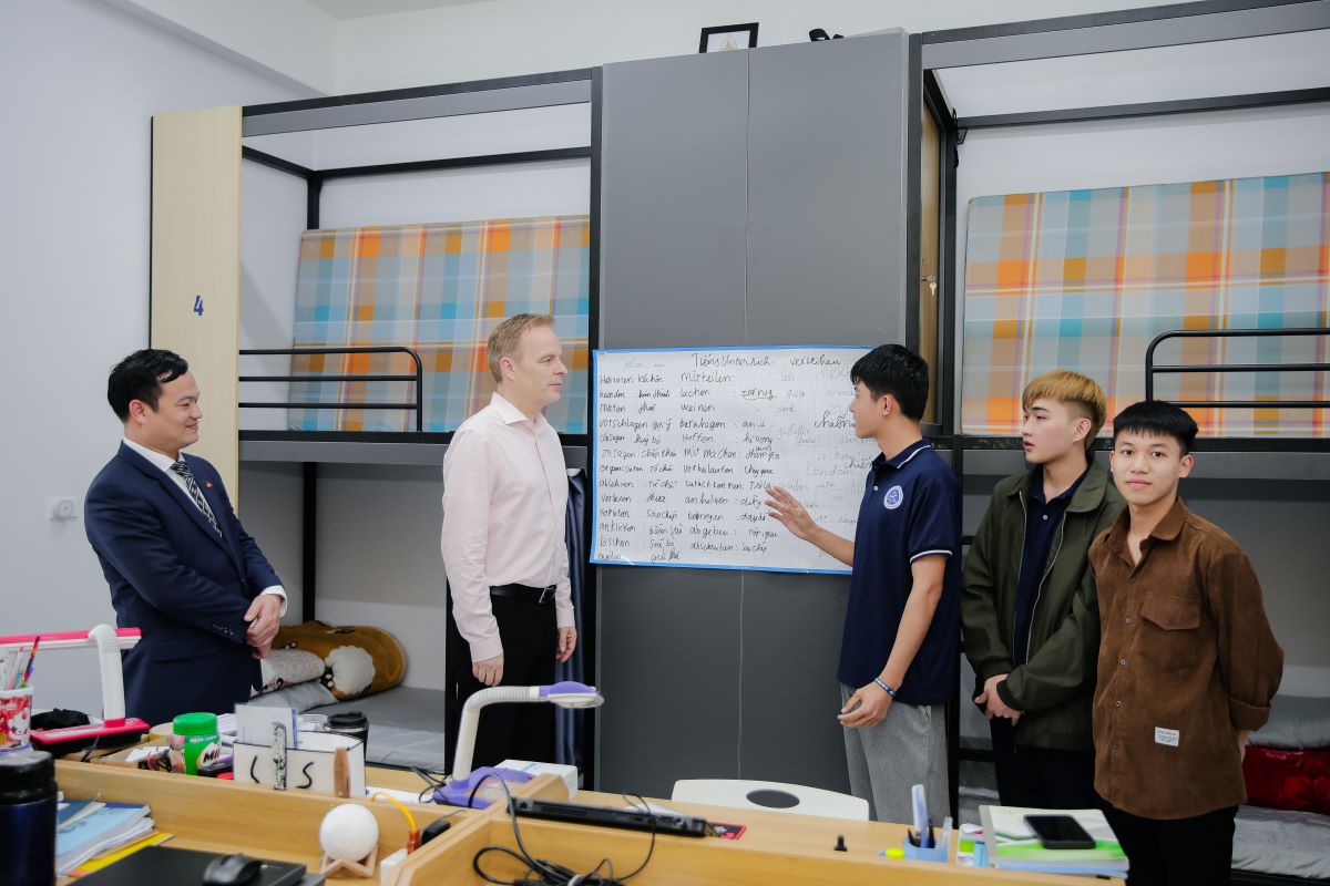 Đoàn đặc biệt quan tâm tới các ngành nghề đào tạo như: Điện – Điện tử, Công nghệ thông tin, Công nghiệp bán dẫn, ngành ngôn ngữ Đức, đồng thời có buổi gặp gỡ, giao lưu với các em sinh viên du học sinh Đức tại hệ thống giáo dục HPC-HPC với mong muốn hợp tác, đào tạo phát triển nguồn nhân lực có kỹ năng nghề, tạo cơ hội cho các em sinh viên trong hệ thống giáo dục HPC – HPC được học tập, làm việc tại CHLB Đức trong thời gian tới.