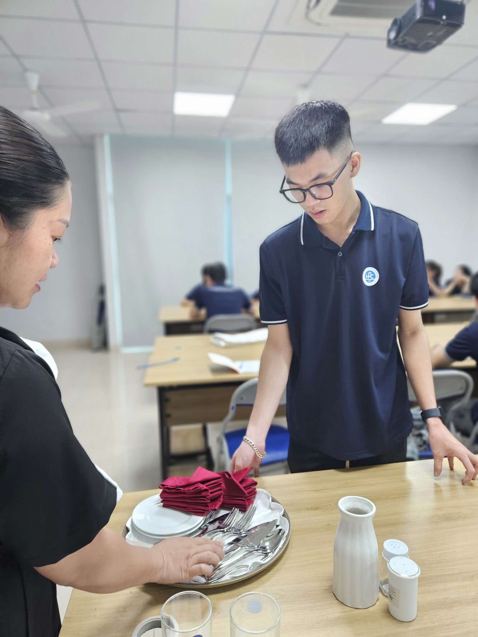 Ngay từ những ngày đầu năm nhất, Huy đã không bỏ lỡ bất kỳ cơ hội học hỏi nào. Cậu luôn là người đến sớm nhất lớp, ghi chép cẩn thận từng bài học, và xung phong tham gia các buổi thực hành tại khách sạn đối tác của trường. “Ngành này không cho phép mình làm đại khái, vì khách hàng có thể cảm nhận được sự thiếu chân thành từ một nụ cười không thật,” Huy chia sẻ.
