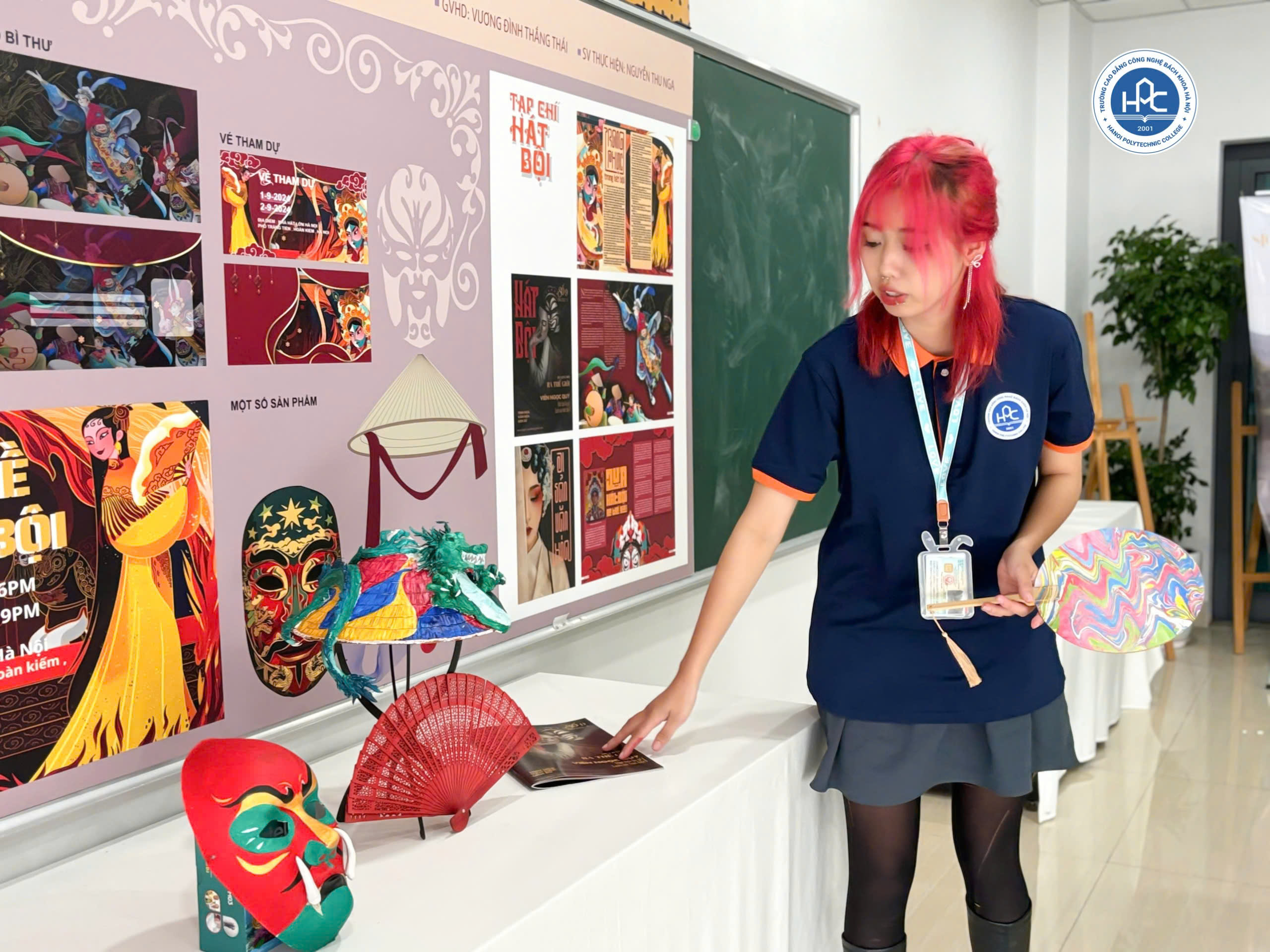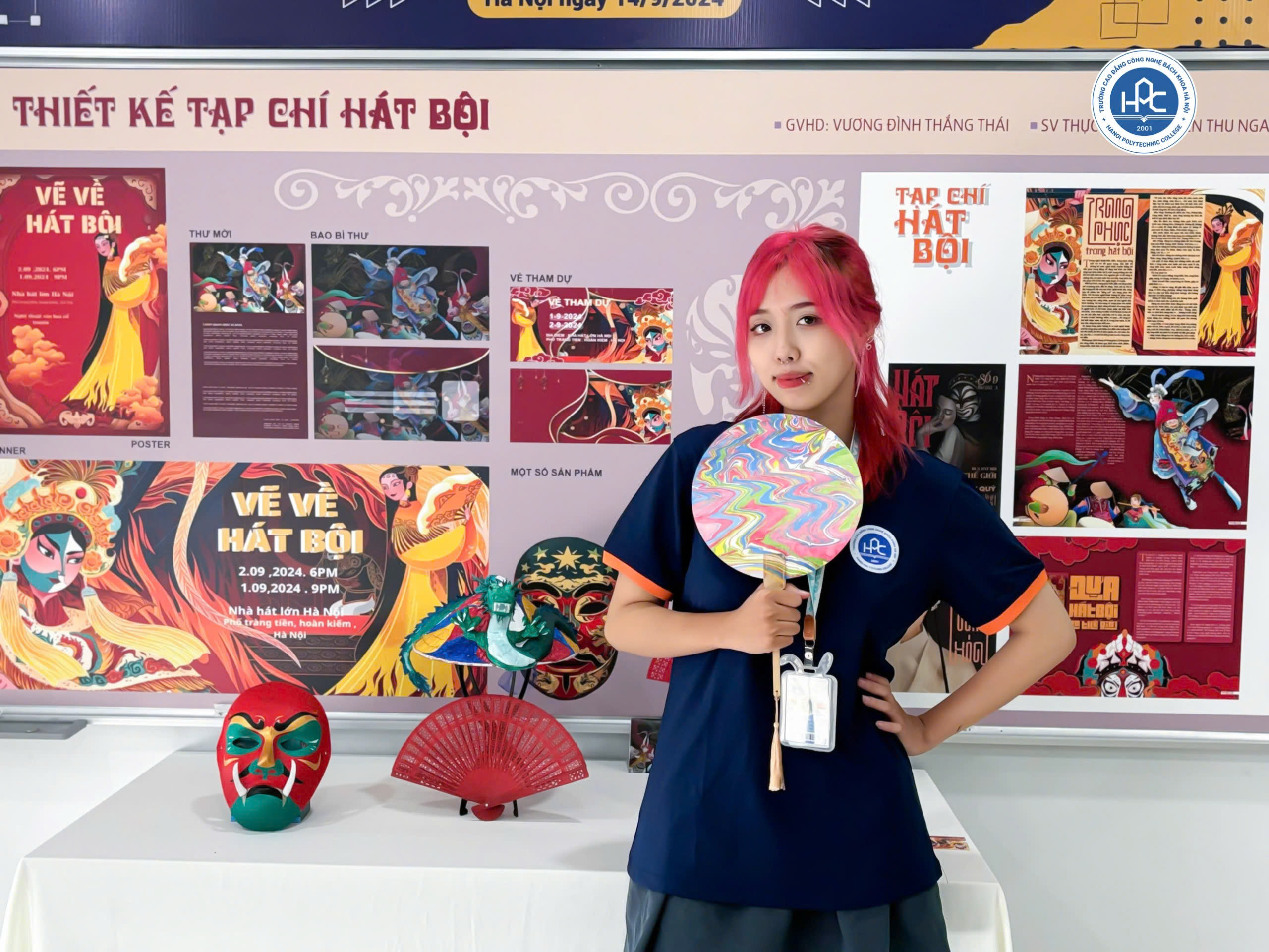 “Thiết kế tạp chí Hát Bội” là sản phẩm Thu Nga làm. Em tự tin đứng trên bục, thuyết trình về ý tưởng và niềm đam mê của mình với văn hóa truyền thống Việt Nam, đặc biệt là hát bội.