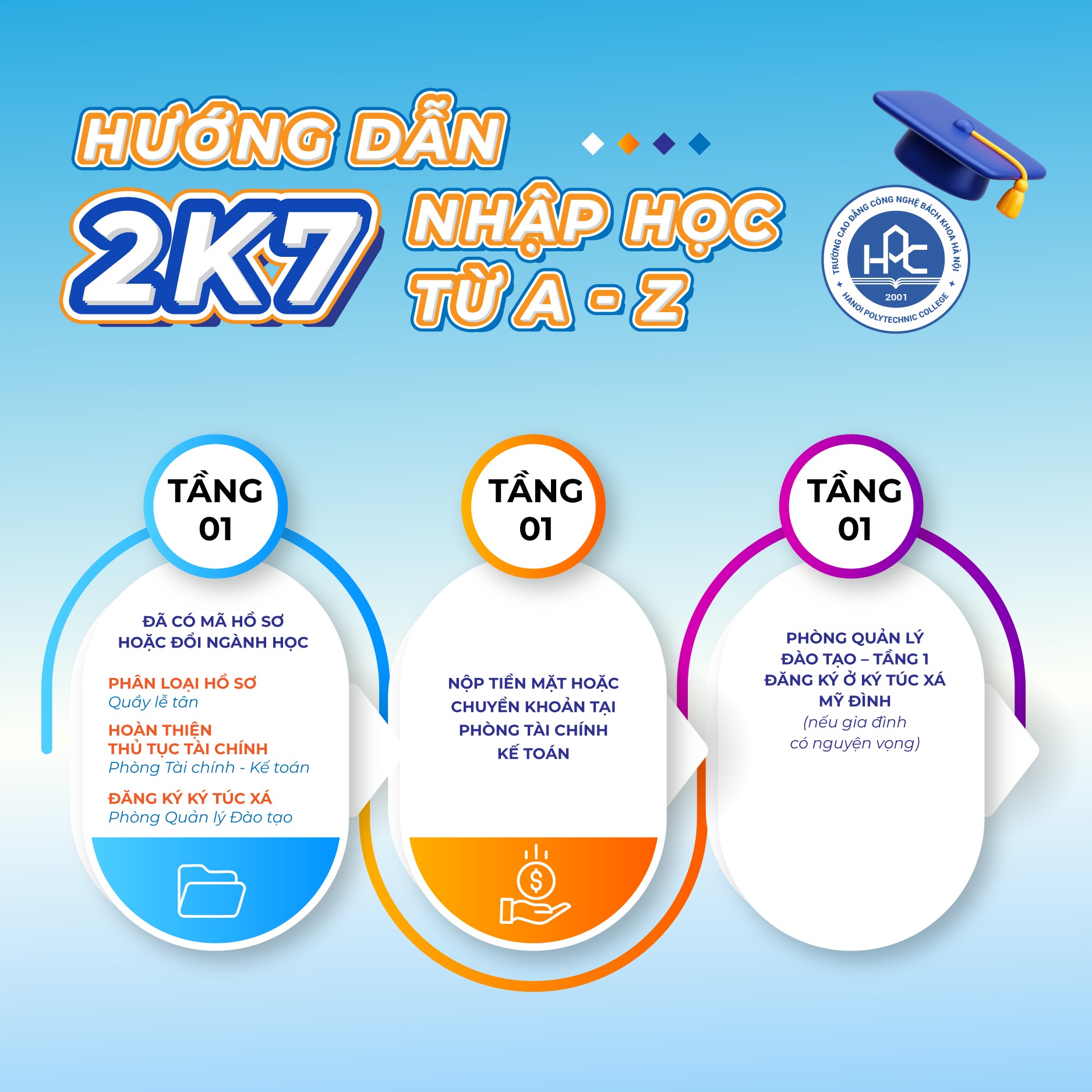 Chỉ cần xem sơ đồ – đi đúng lộ trình – hoàn tất thủ tục, bạn sẽ nhận đầy đủ: thẻ sinh viên, đồng phục, lịch học và cả những món quà chào đón từ HPC.