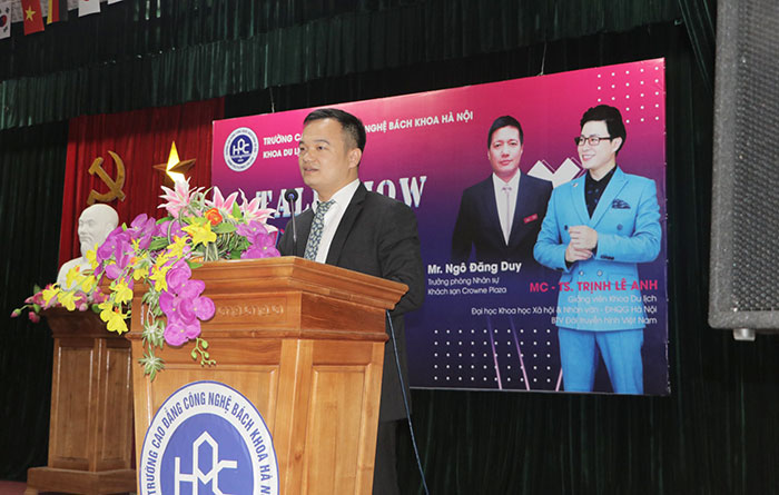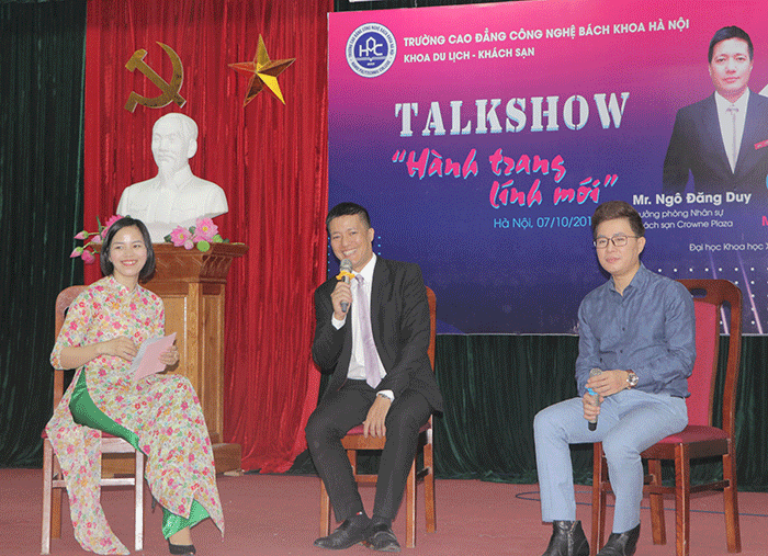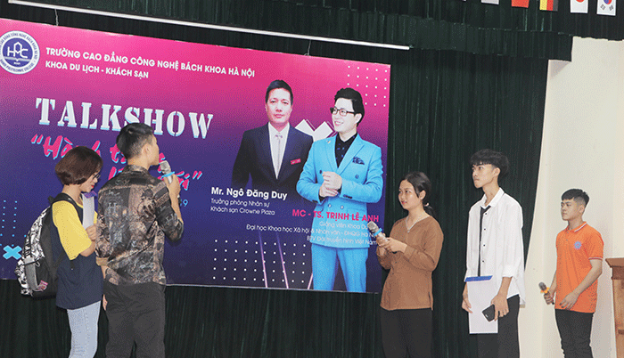 Talkshow có sự hiện diện của MC TS. Trịnh Lê Anh – Giảng viên khoa Du lịch, Đại học Khoa học xã hội và Nhân văn, ĐHQGHN, BTV Đài Truyền hình Việt Nam; Ông Ngô Đăng Duy – Trưởng phòng nhân sự khách sạn Crown Plaza West Hà Nội; Ban lãnh đạo cùng các cán bộ giảng viên và toàn thể các em sinh viên khoa Du lịch – Khách sạn, Trường Cao đẳng Công nghệ Bách khoa Hà Nội.