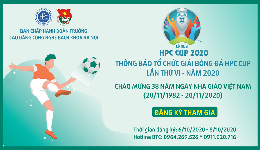 Nhằm thiết thực đẩy mạnh phong trào thi đua lập thành tích chào mừng kỷ niệm 38 năm ngày nhà giáo Việt Nam (20/11/1982 – 20/11/2020). Đồng thời, tạo sân chơi bổ ích, góp phần xây dựng tinh thần đoàn kết, rèn luyện tính tích cực, giao lưu, học hỏi lẫn nhau giữa các cá nhân, đơn vị trong nhà trường, Trường Cao đẳng Công nghệ Bách khoa Hà Nội THÔNG BÁO KẾ HOẠCH TỔ CHỨC GIẢI BÓNG ĐÁ HPC CUP LẦN THỨ 6 NĂM 2020.