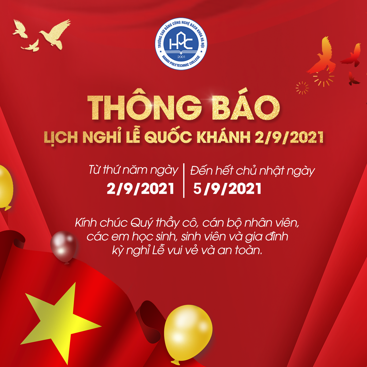 Hiệu trưởng Trường Cao đẳng Công nghệ Bách khoa Hà Nội thông báo tới toàn thể Giảng viên, sinh viên, học sinh kế hoạch nghỉ lễ Quốc khánh 02/9/2021 như sau: Từ thứ năm 02/9/2021 – Đến hết chủ nhật 05/9/2021.