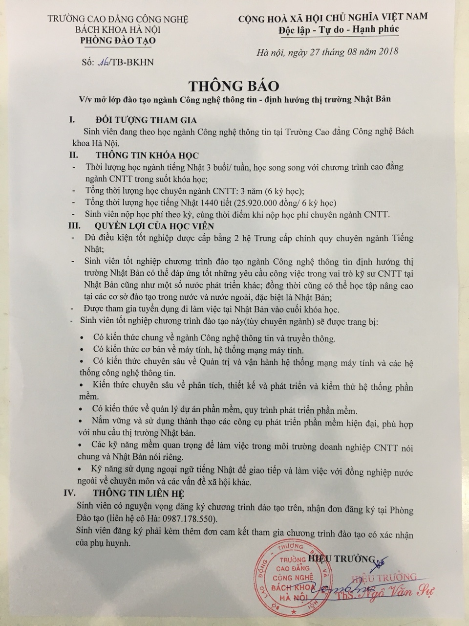 ĐỂ TRIỂN KHAI CHƯƠNG TRÌNH, TRƯỜNG CAO ĐẲNG CÔNG NGHỆ BÁCH KHOA HÀ NỘI THÔNG BÁO MỞ LỚP ĐÀO TẠO NGÀNH CÔNG NGHỆ THÔNG TIN – ĐỊNH HƯỚNG THỊ TRƯỜNG NHẬT BẢN