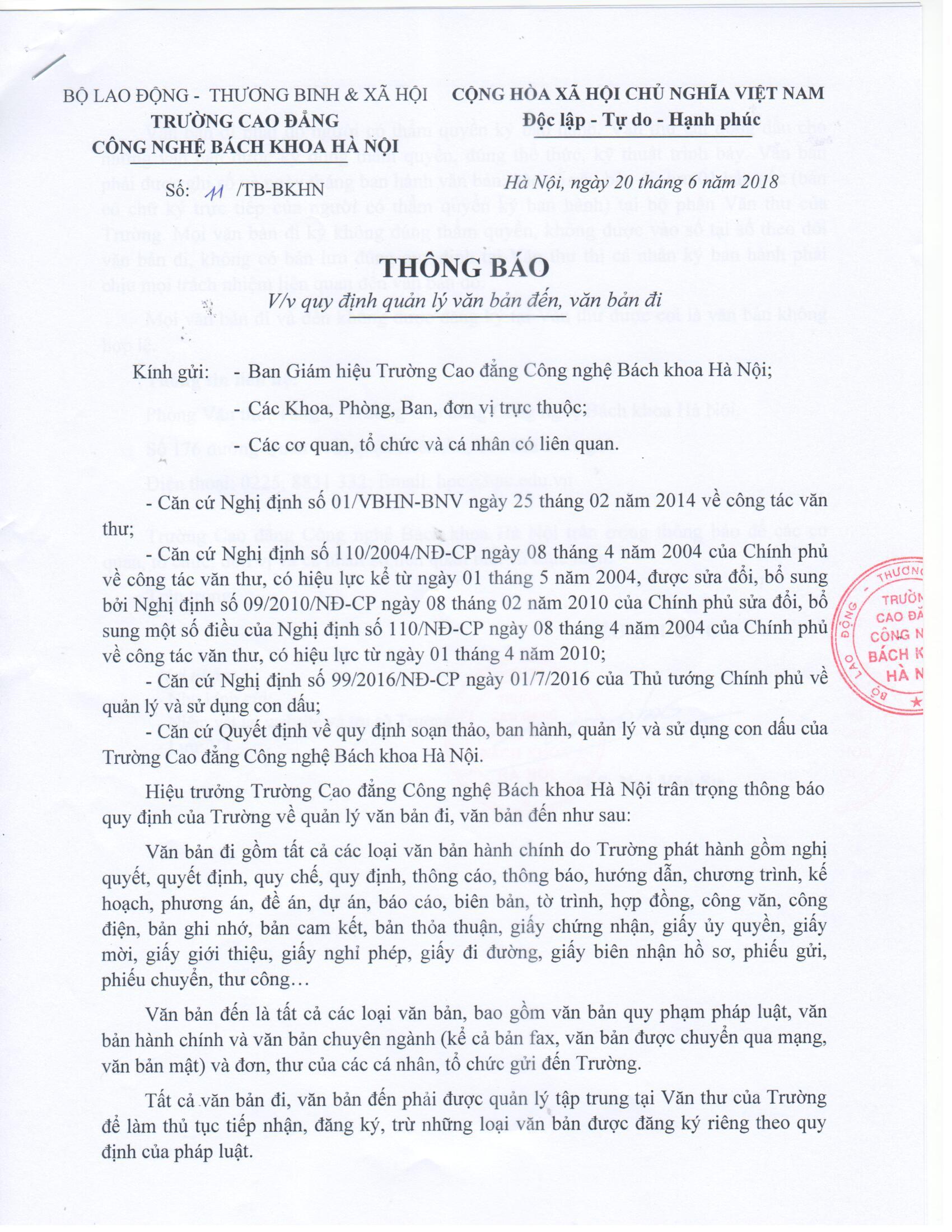 Trường Cao đẳng Công nghệ Bách khoa Hà Nội: Thông báo Quy định quản lý Văn bản đến, Văn bản đi