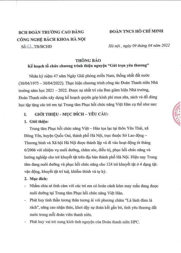 ĐOÀN THANH NIÊN HPC: Thông báo chương trình thiện nguyện “Gửi trọn yêu thương”