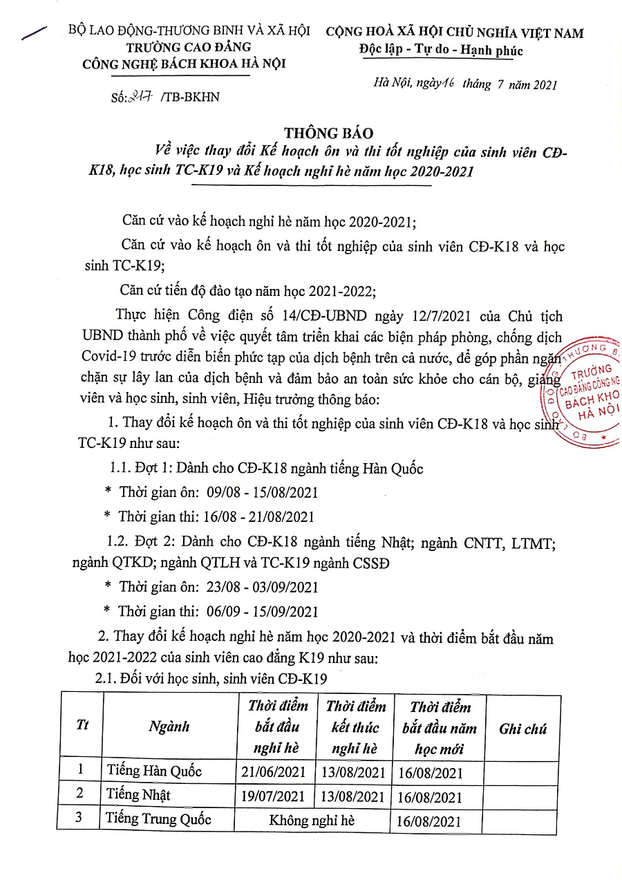 Thông báo: Về việc thay đổi kế hoạch ôn và thi tốt nghiệp của sinh viên CĐ – K18, học sinh TC – K19 và Kế hoạch nghỉ hè năm học 2020 – 2021.