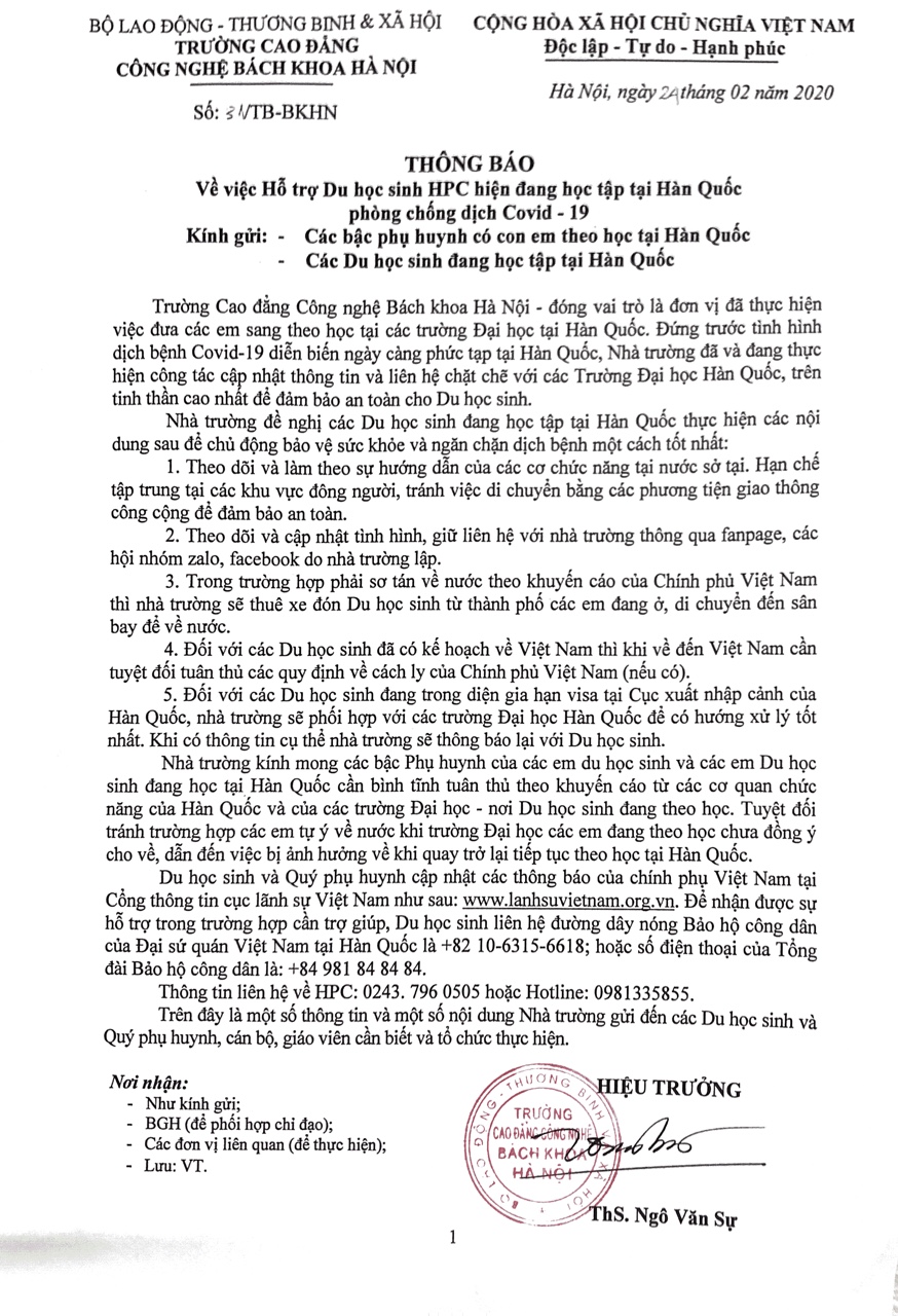 HPC - Đứng trước tình hình dịch bệnh Covid-19 diễn biến ngày càng phức tạp tại Hàn Quốc, Trường Cao đẳng Công nghệ Bách khoa Hà Nội đã và đang...