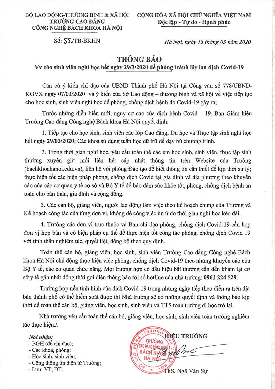 HPC - THÔNG BÁO CỦA TRƯỜNG CAO ĐẲNG CÔNG NGHỆ BÁCH KHOA HÀ NỘI GỬI ĐẾN TOÀN THỂ SINH VIÊN, DU HỌC SINH, THỰC TẬP SINH VỀ VIỆC TIẾP TỤC...