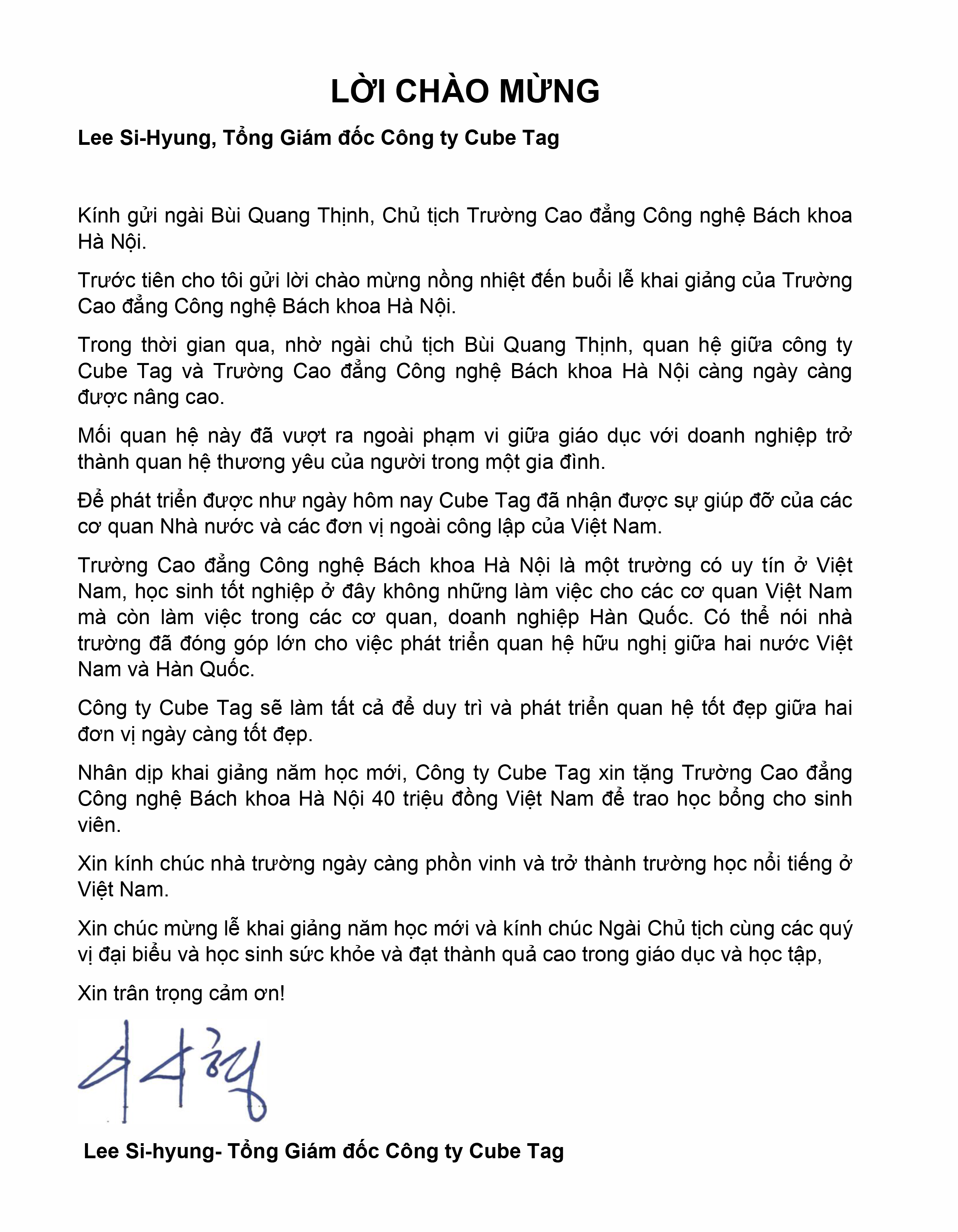 Trường Cao đẳng Công nghệ Bách khoa Hà Nội xin trân trọng trích đăng Thư chúc mừng của Ngài Lee Si-Hyung – Tổng Giám đốc Công ty Cube Tag Vina.