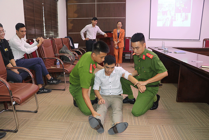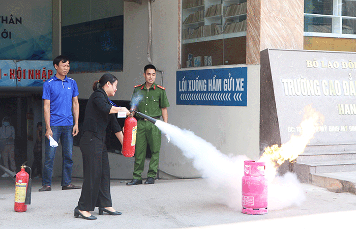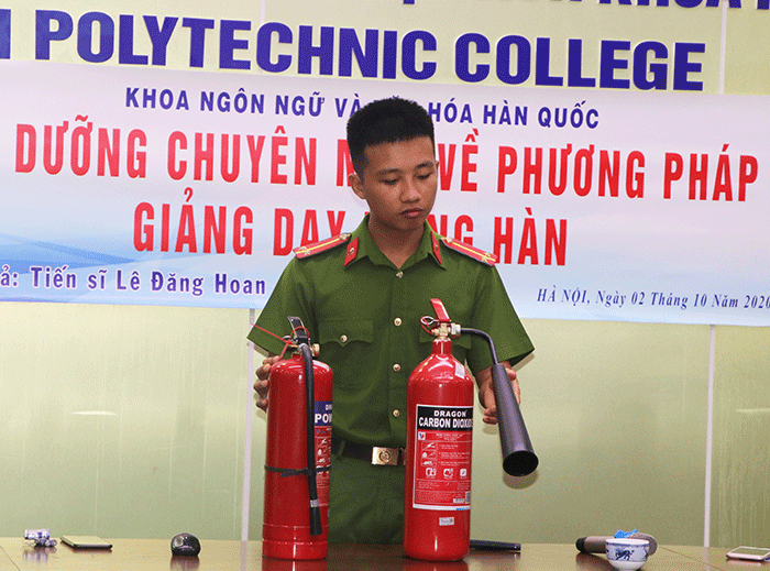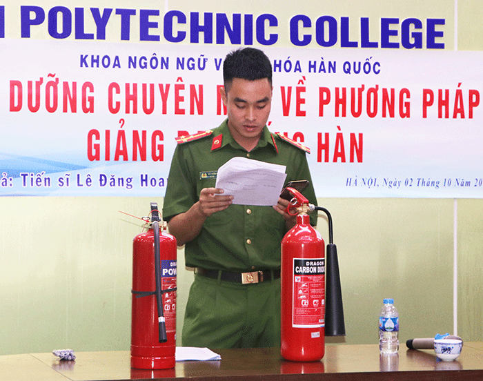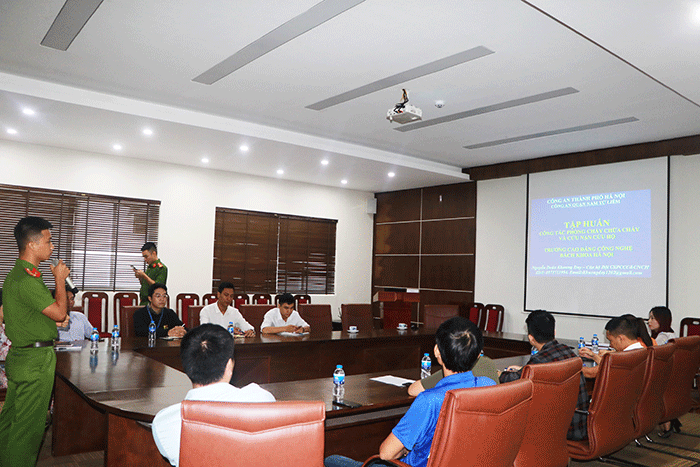 Tham gia buổi tập huấn có đồng chí: Nguyễn Doãn Khương Duy và đồng chí Vũ Tuấn Quỳnh – cán bộ đội Cảnh sát PCCC&CNCH, Quận Nam Từ Liêm, Hà Nội cùng 16 cán bộ, giảng viên đến từ các khoa – phòng ban của nhà trường.