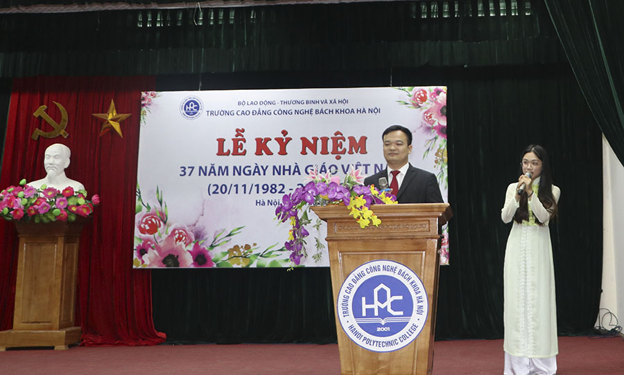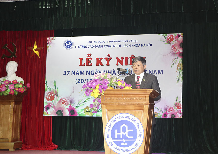 Thay mặt cán bộ, giảng viên, sinh viên toàn trường, Thầy Ngô Văn Sự – Hiệu trưởng nhà trường bày tỏ niềm vui và trân trọng chào đón các đồng chí lãnh đạo, cùng đội ngũ cán bộ, giảng viên, sinh viên đã về chung vui với Nhà trường trong dịp tri ân Ngày Nhà giáo. Thầy Ngô Văn Sự dành thời gian ôn lại lịch sử hình thành, phát triển của nhà trường; tổng kết các kết quả đạt được của Trường Cao đẳng Công nghệ Bách khoa Hà Nội 18 năm qua; đưa ra những định hướng, chiến lược phát triển nhà trường trong thời gian tới. Từ đó, kêu gọi các thầy cô giáo, các em sinh viên HPC cùng đoàn kết, giữ vững truyền thống, đổi mới, sáng tạo cùng chung sức tạo dựng thương hiệu Trường Cao đẳng Công nghệ Bách khoa Hà Nội phát triển lên một tầm cao mới.