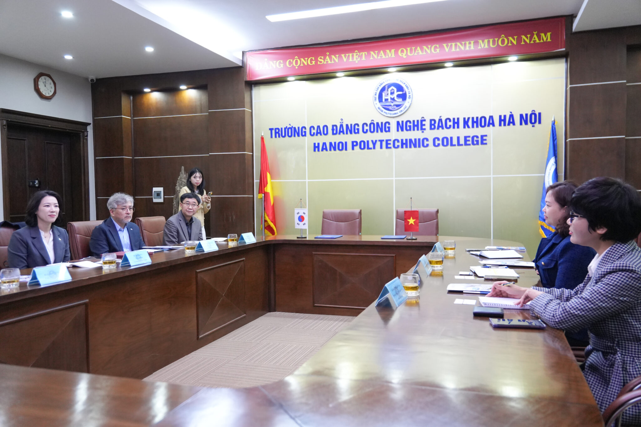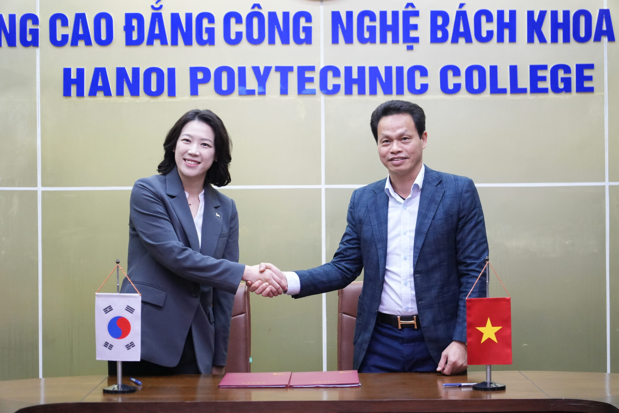 Tham gia Lễ ký kết, về phía Trường Cao đẳng Công nghệ Bách khoa Hà Nội có sự hiện diện của: Cô Lê Thị Quỳnh Anh – Chủ tịch Hội đồng Nhà trường; Thầy Phạm Quốc Hoàn – Hiệu trưởng Nhà trường; Cô Mai Thị Thanh Hoài – Trưởng Khoa Ngôn ngữ và Văn hoá Hàn Quốc