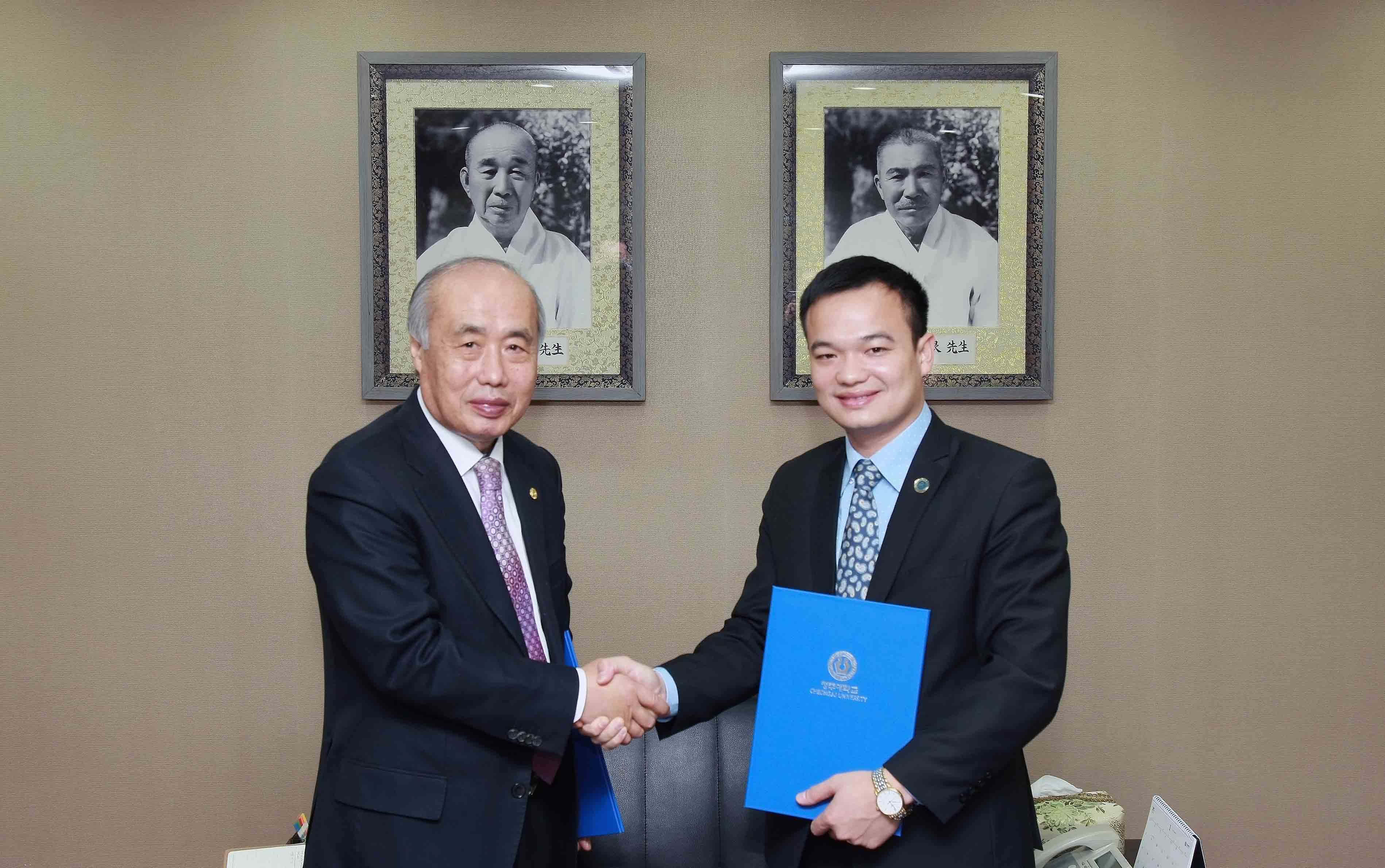 Đặc biệt, trong chuyến công tác này, thầy Bùi Quang Thịnh, Chủ tịch Hội đồng giáo dục của Trường Trung cấp Công nghệ bách khoa Hà Nội và đoàn đã có buổi đến thăm và làm việc với Ban giám hiệu trường Đại học Cheongju. Tại đây, thầy Bùi Quang Thịnh và thầy Hiệu trưởng Chung, Sung Bong Ph.D đã ký kết văn bản hợp tác liên kết đào tạo giữa hai trường.