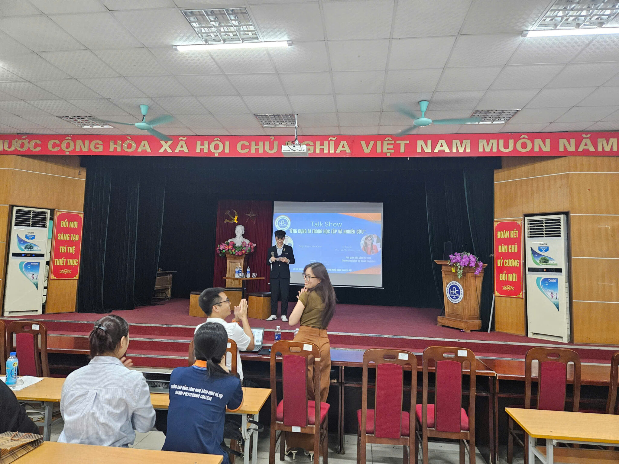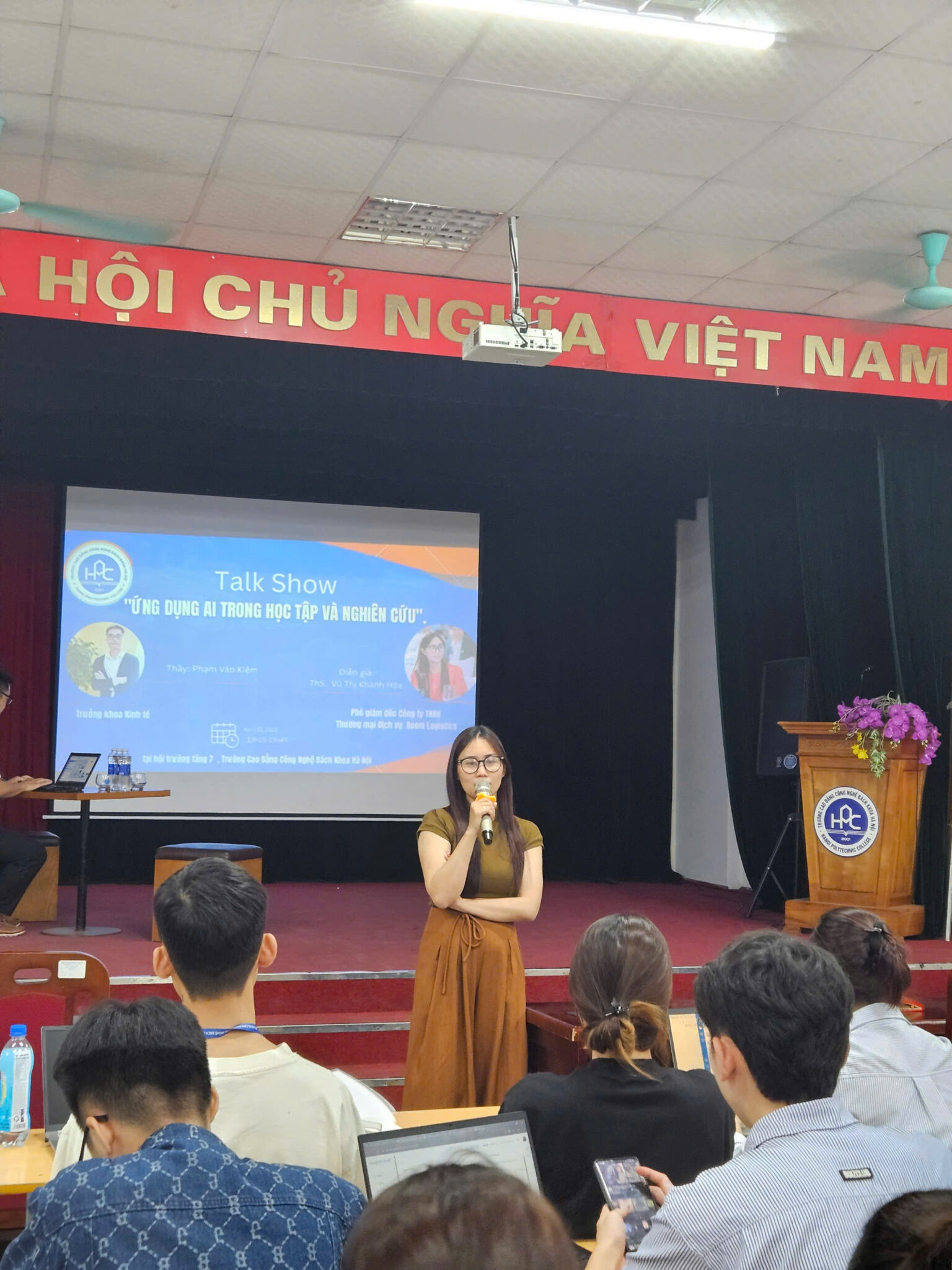 Vị khách mời đặc biệt đến từ doanh nghiệp – ThS. Vũ Thị Khánh Hòa, Phó GĐ BOOM Logistics đã chia sẻ từ góc nhìn của một quản lý doanh nghiệp: “Trước bối cảnh công nghệ AI đang rất phát triển, chúng ta phải luôn luôn trong tâm thế tiếp nhận và tiếp cận công nghệ và luôn luôn học hỏi và hoàn thiện bản thân để làm chủ được công nghệ và sử dụng hiệu quả nó”.